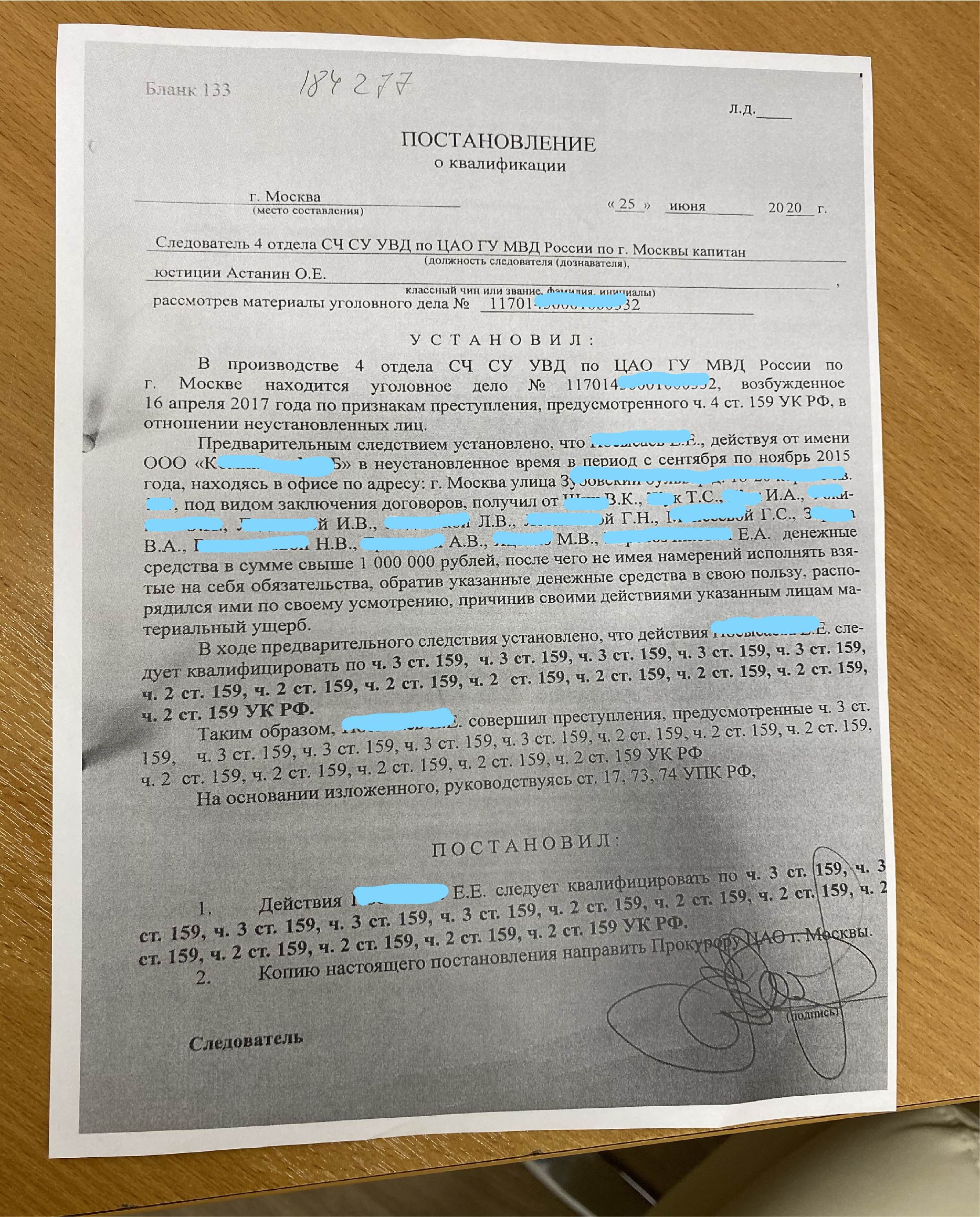 | 3035 | Уголовные дела на рынке кредитования по ч. 4 ст. 159 УК РФ. Как следственные органы квалифицируют деятельность «Финансовых пирамид». | Решение о переквалификации.jpg | без описания | Для всех |