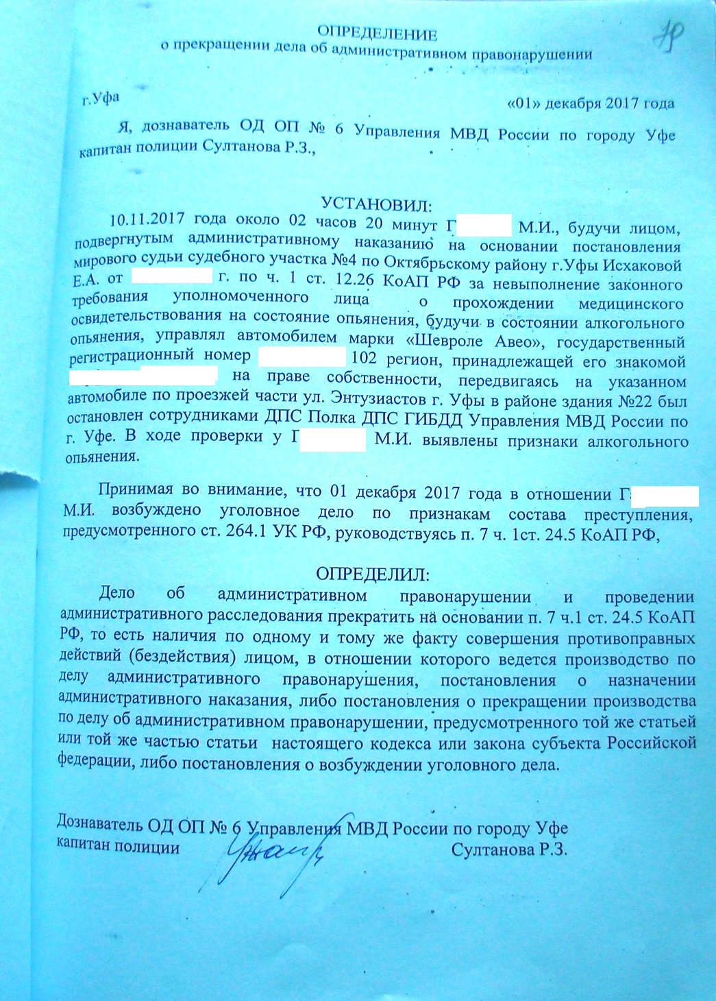 Уголовно - процессуальным кодексом РФ предусмотрены полномочия следователя (п.п. 3, 6 ч. 2 ст. 38 УПК РФ) и дознавателя (п.п. 1, 2 ч. 3 ст. 41 УПК РФ) самостоятельно производить следственные и иные процессуальные действия и принимать процессуальные решения, а также осуществлять иные полномочия. На практике подобная независимость нередко выражается в принятии решений, которым затруднительно дать какое - либо нормативное обоснование. В настоящее время защищаю своего доверителя по ст. 264.1 УК РФ. В ходе ознакомления с материалами уголовного дела мне на глаза попалось "ОПРЕДЕЛЕНИЕ о прекращении дела о административном правонарушении", которое было вынесено дознавателем со ссылками на нормы КоАП РФ, но в рамках расследования уголовного дела ?!? Я высказал свое недоумение относительно данного решения, но получил шедевральный ответ "У нас такая практика, которая согласована с районной прокуратурой".