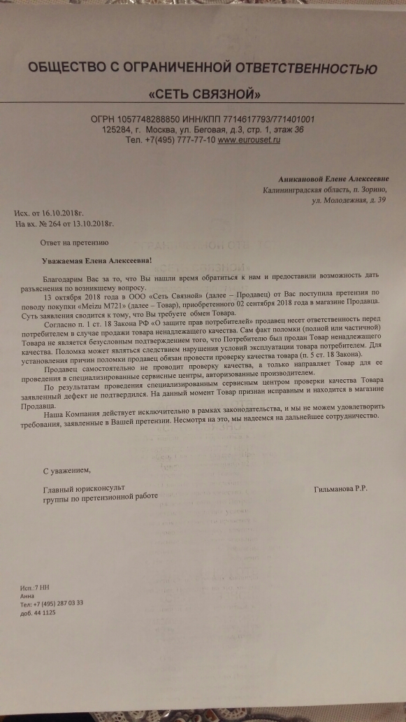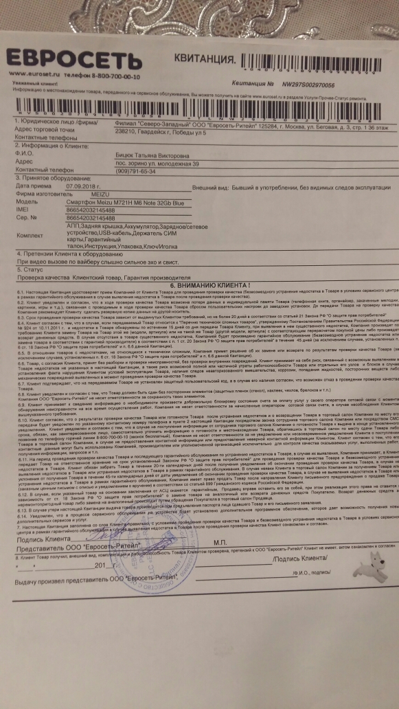 2 сентября 2018 года взяла в рассрочку телефон в Евросети города Гвардейска. Спустя пару дней обнаружила в нем проблему со связью ,во время разговоров по видеовызовам,из-за моего телефона сильное эхо.7 сентября 2018 мы отдали телефон на проверку качества,сказали в течении 20 дней проверка будет сделана,но телефон я увидела спустя 5 недель.Когда пришла забирать его,сказали что никакой проблемы нет,НО она есть. Тогда мне предложили написать претензию на обмен товара. Сказали в течении 10 дней придет ответ. Но в течении 10 дней мне никто не позвонил,через 13 дней я поехала сама узнать.Мне пришел ответ ,что обмена не будет. И что делать дальше я не знаю. Четыре тысячи я уже заплатила,скоро второй платеж,а как я могу платить за такой телефон.