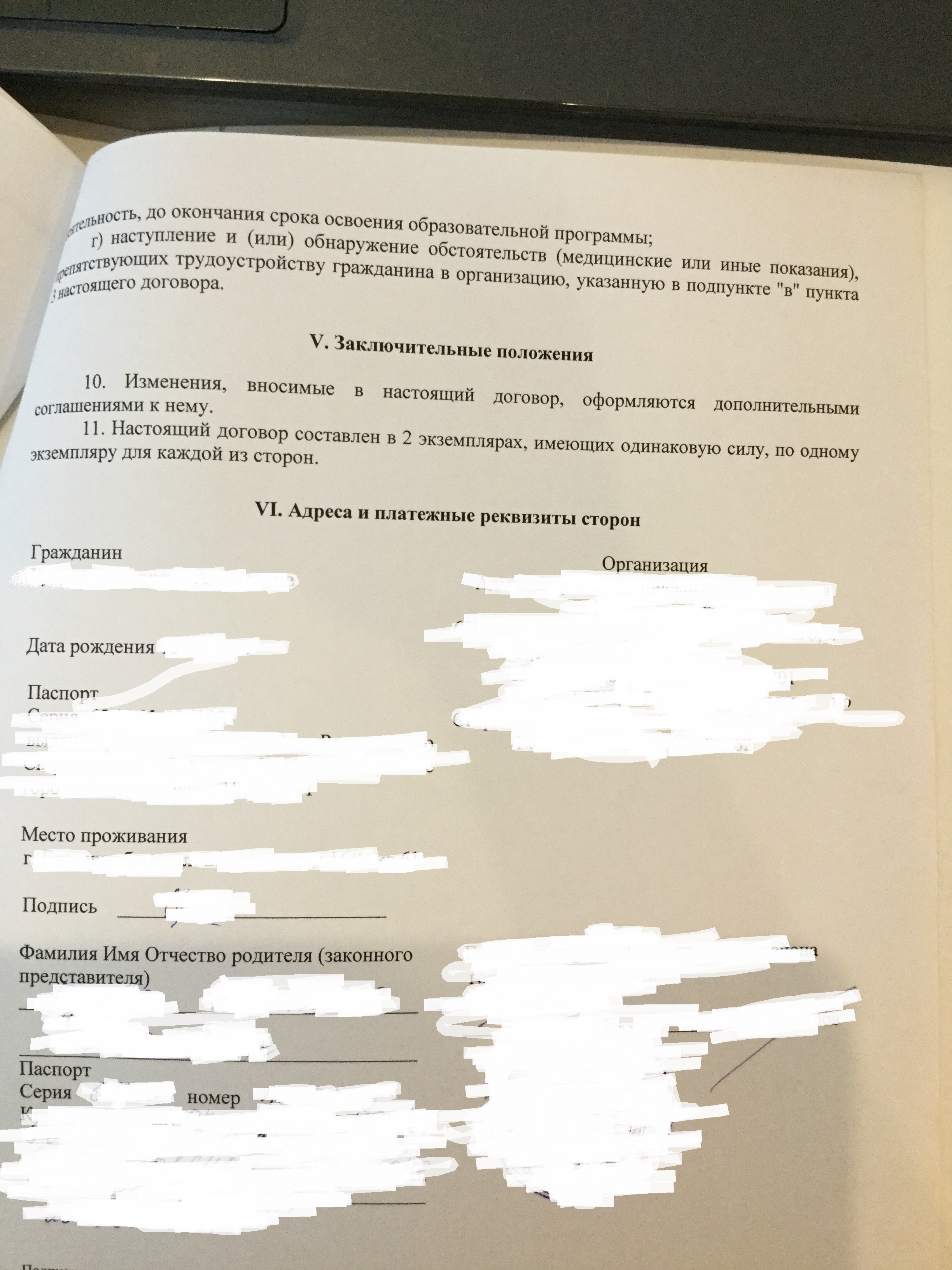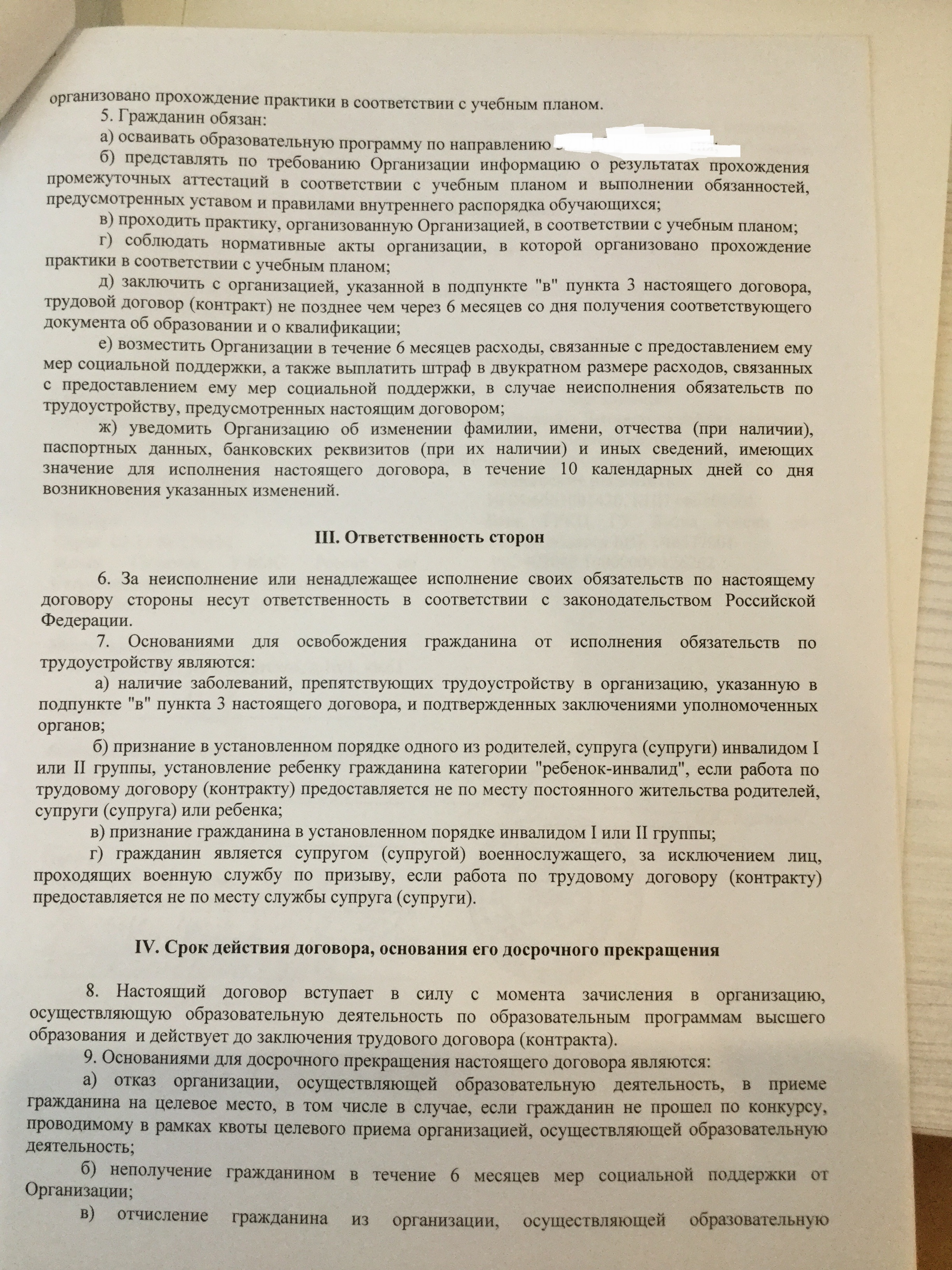 В соответствии с п.6 заключенного Вами договора за неисполнение, взятых на себя обязательств, в том числе предусмотренных п.1, пп. а)-д) п.5 указанного договора, Вы несете ответственность в соответствии с законодательством РФ.