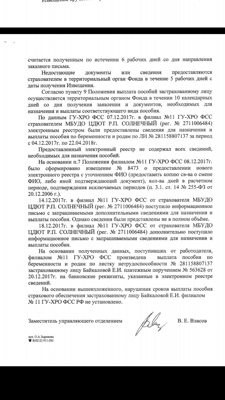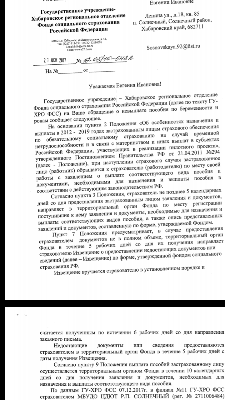 Здравствуйте,у меня такая ситуация,4 декабря 2017 года я ушла в декретный отпуск. На дворе уже 25 декабря,а декретных выплат я так и не получила. Я обращалась письменно в ФСС Хабаровского края,получила письмо оттуда,в котором было указано то,что трижды ФСС делал запрос моему работодателю о том,что сданы не все дополнительные документы,в итоге все затянулось. И уже вроде бы отправили деньги на мои реквизиты,но оказалось,что отправили их в тот банк,где моя карта заблокирована по истечению срока годности и паспортные данные мои тоже поменялись в связи со вступлением в брак. Сейчас я нахожусь в городе Улан-Удэ,а ближайший офис мтс-банка находится в Иркутске,куда я физически уже не могу поехать для изменения данных и снятия денег,в связи с большим сроком беременности. Ошибку допустил бухгалтер,который отправил не действующие мои зарплатные реквизиты,а те,которыми я уже давно не пользуюсь. Есть ли со стороны моего работодателя и бухгалтера правонарушения и могу ли я подать в суд на свою организацию,находящуюся в Хабаровском крае Солнечном районе п. Солнечный,находясь в Улан-Удэ? Что я могу сделать вообще,что бы наказать работодателя и бухгалтера? У меня на руках маленькая дочь и я разведена,на носу Новый год,а в кошельке ни копейки денег.