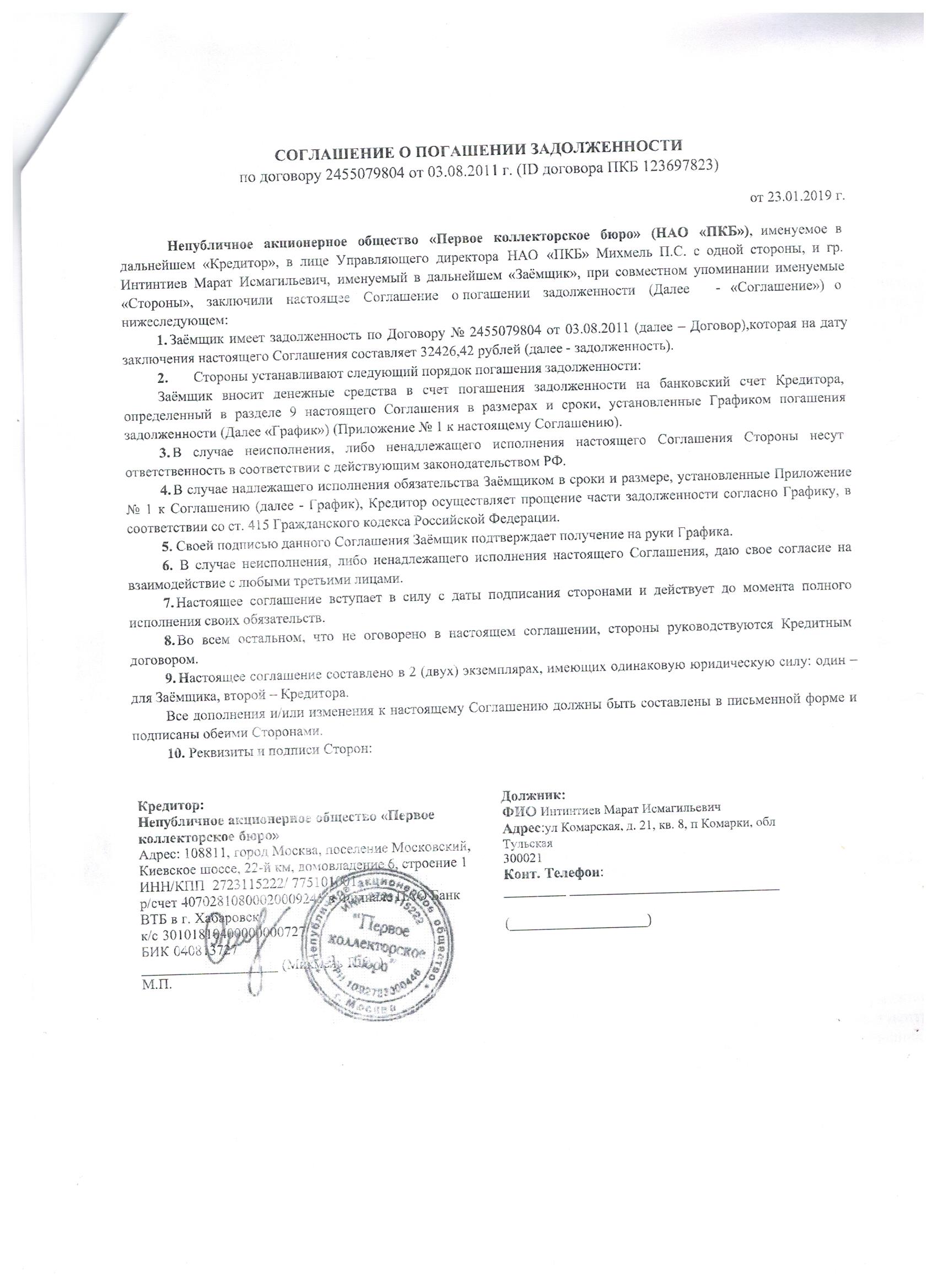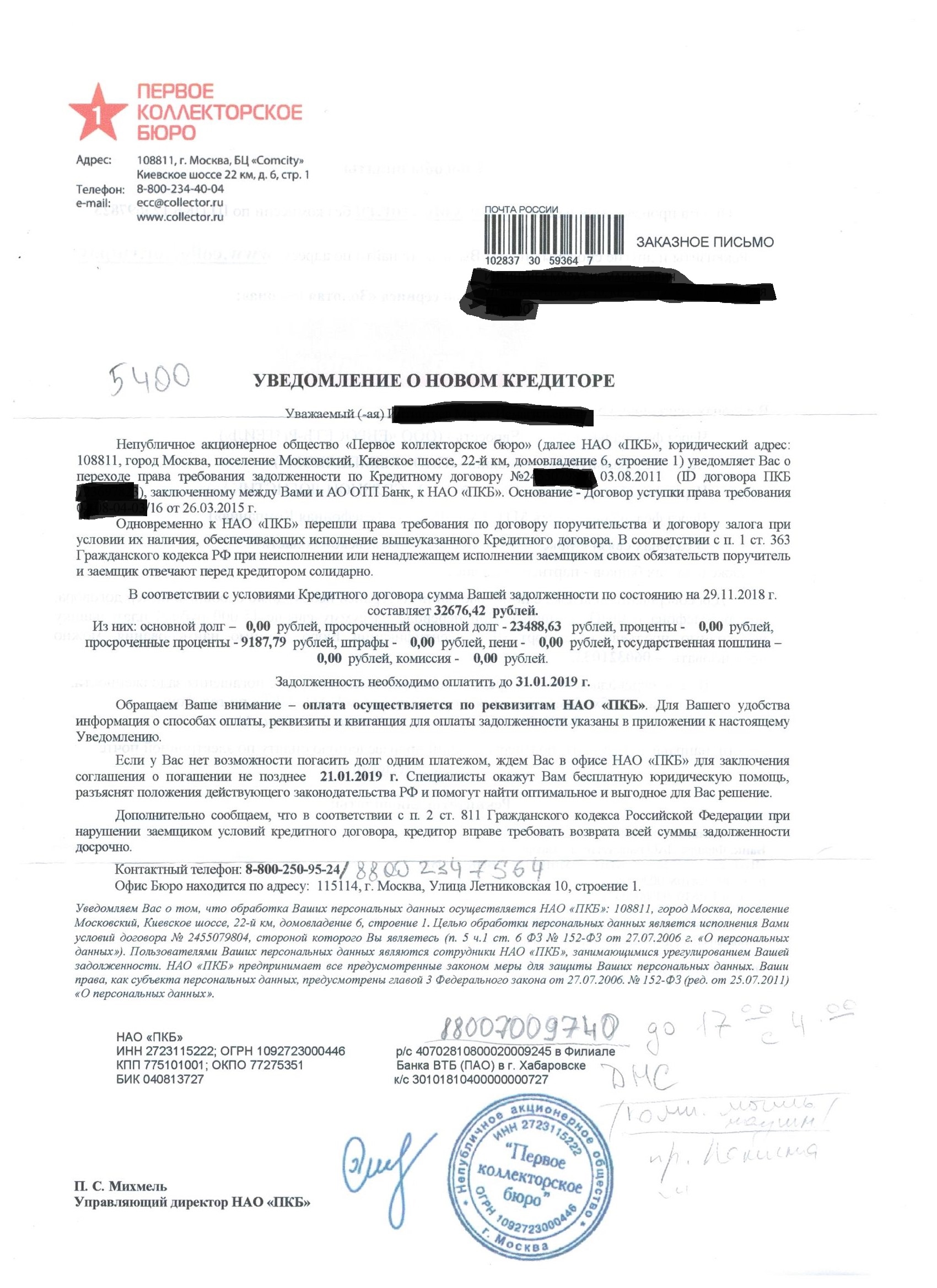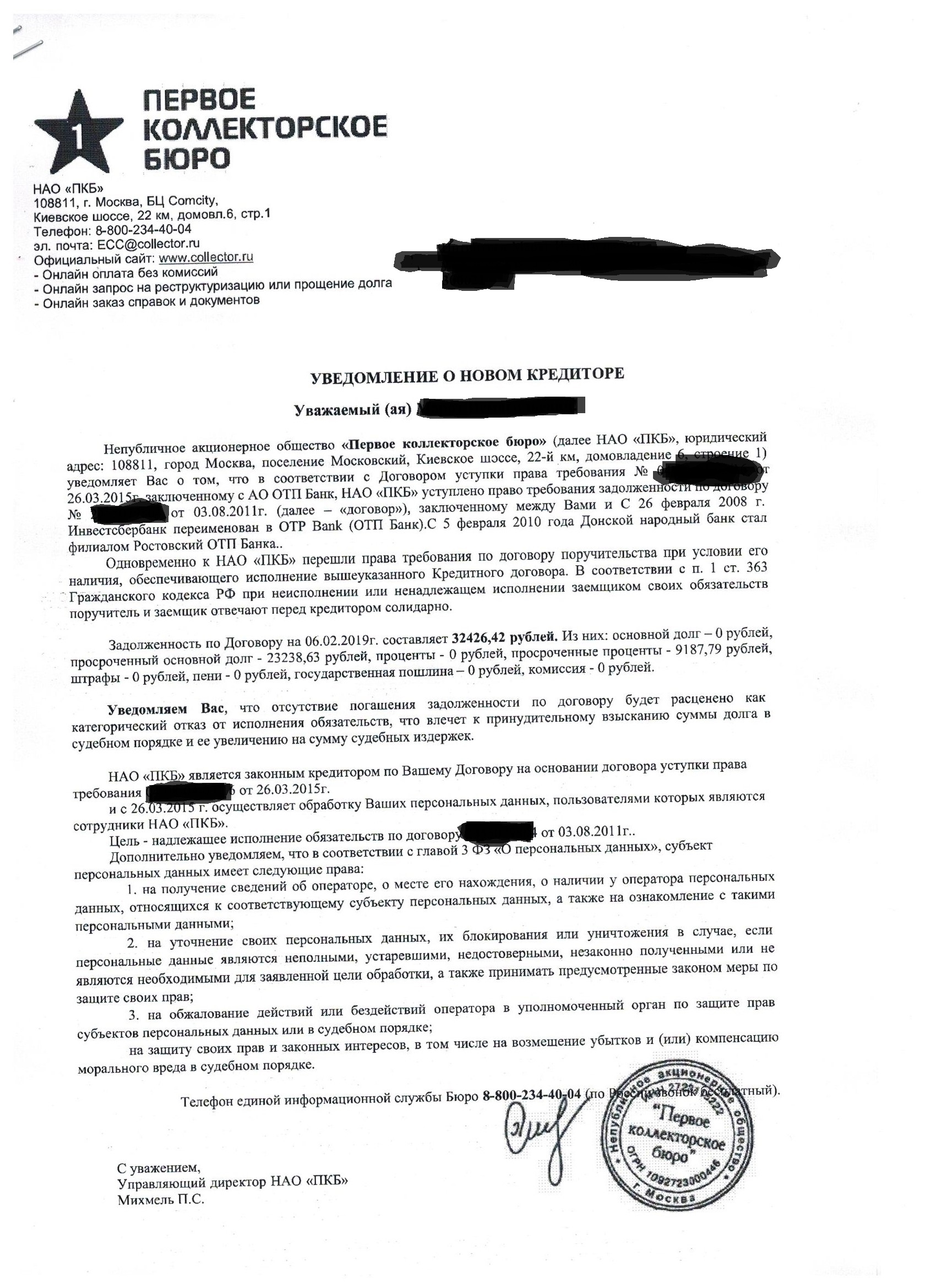 НАО "ПКБ" прислали документы о том что они теперь владеют моим кредитом от ОТП Банка. Суда по поводу кредита не было. Брал я его в 2011, к ним говорят перешли права на него в 2015. Письмо с уведомлением на адрес родителей пришло 15.12.2018.Документы из письма и документы что мне выслали на эл. почту прилагаю.Вопрос таков - должен ли я им платить что либо? В договоре фигурирует ОАО"ПКБ", НАО"ПКБ" - как вести с ними диалог - подскажите(и вести ли вообще)?