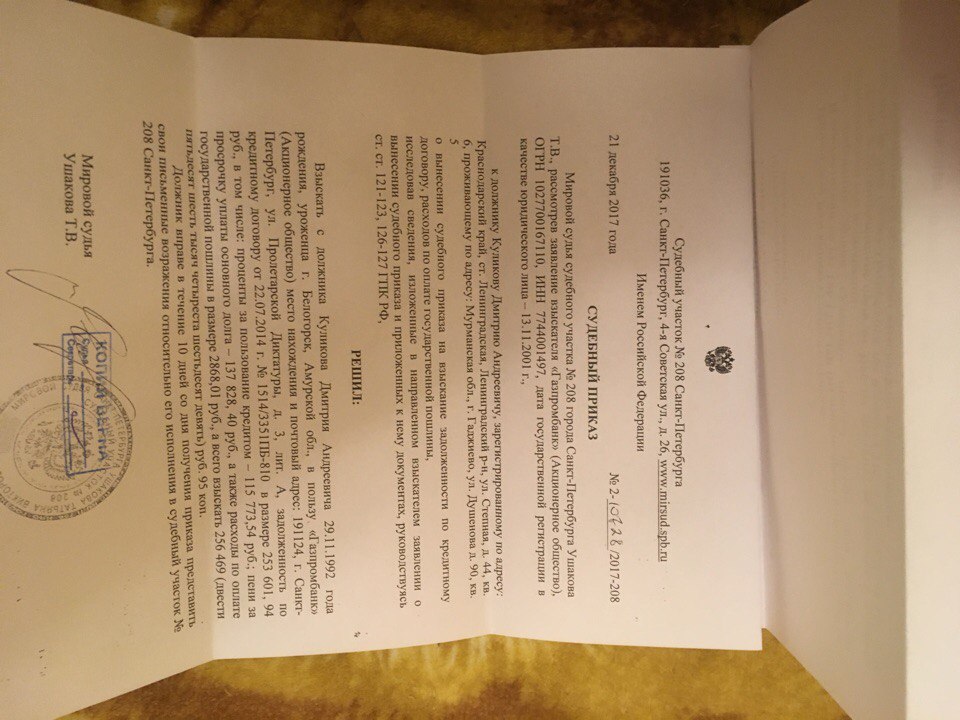 Здравствуйте, в Вашей ситуации имеет место судебный приказ, то есть разновидность судебного решения, выданного в приказном порядке, что предусмотрено главой 11 ГПК РФ. При этом такой порядок предусматривает подачу заявления от кредитора в суд о вынесении судебного приказа. И на основании ст.ст.126, 128 ГПК РФ суд без судебного разбирательства и вызова сторон в течении 5 дней выносит судебный приказ и о нем извещает должника и разъясняет должнику его право подать в 10-дневный срок с момента получения копии приказа письменных возражений по исполнению приказа.