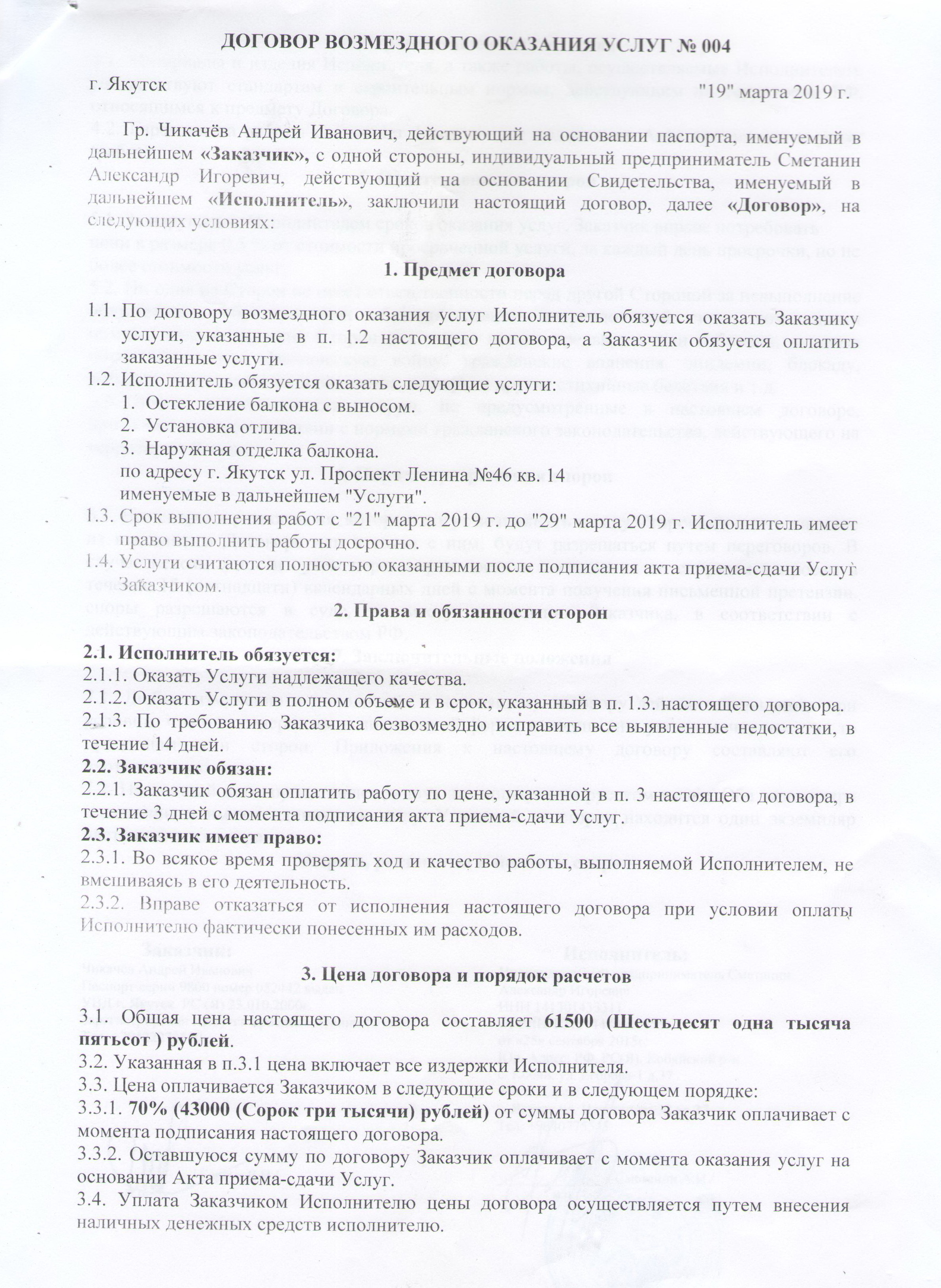 Добрый день! У меня был заключён договор возмездных услуг по остеклению балкона с ИП Сметаниным А.Г. 19 марта 2019 г. на сумму 61500 руб. Срок исполнения работ по договору до 29 марта 2019 г. Предварительная оплата составила 43000 р. В одностороннем порядке исполнитель отказался от выполнения договора. Согласно п.5.1 договора - оплата неустойки составляет 0,5% от суммы договора за каждый день просрочки. На сегодня просрочка составляет 84 дня. После получения претензии, исполнитель представил расписку, в которой обязался погасить долг до 19 июня 2019 г. На сегодня ни одно условие по договору и расписки не выполнено. Хочу воспользоваться услугами опытного юриста по взысканию долга и морального ущерба. (Вопрос: Сколько такая услуга будет стоить?)