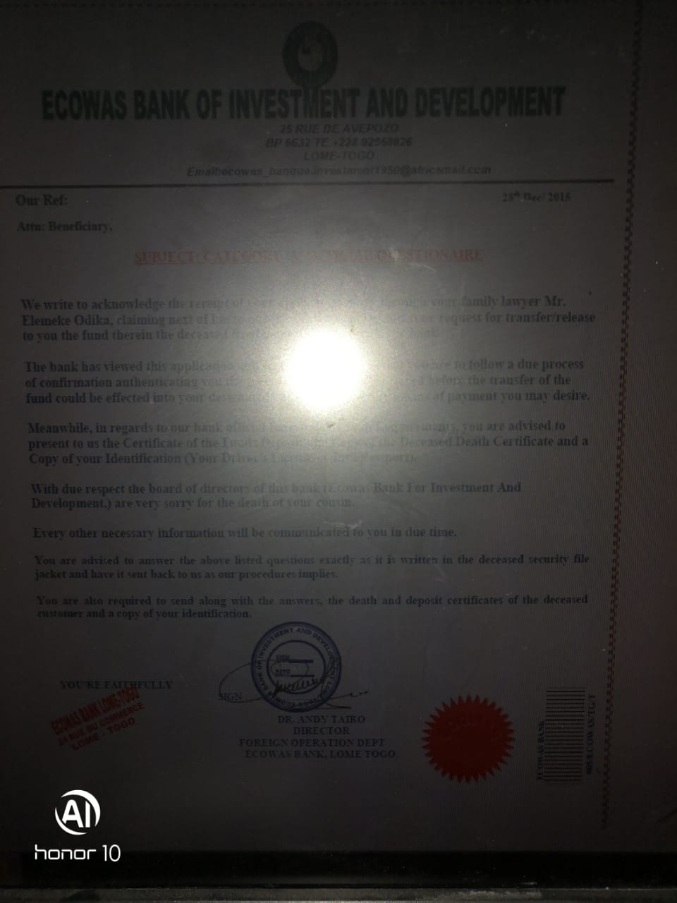 Добрый день. Мужу пришло электронное письмо с указанием того, что он наследник какого то успешного бизнесмена, который погиб в 2015году и юрист не может найти наследников в течение двух лет. Он скинул свои контакты, фото паспорта и завещания,в котором не указан конкретно мой муж, да в принципе никто конкретно не указан. Просят проехать в ближайшее посольство со саоими документами и показать фото документов адвоката, а мол посольство с ним свяжется