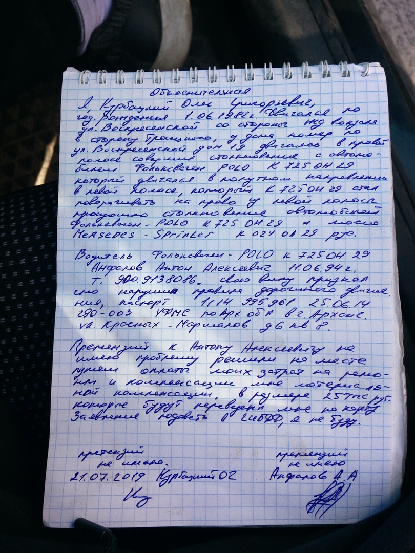 Здраствуйте, меня зовут Антон. 21.07.2019 года я попал в ДТП, управляя автомобилем своей девушки, который зарегистрирован на её маму. В ДТП из людей ни кто не пострадал, только незначительные повреждения ТС (царапины). Сотрудников ДПС, вызывать не стали, вместо этого составили расписку в которой указана сумма ущерба которую я должен был возместить - 25000 тысяч рублей. На момент управления транспортным средством у меня при себе не было водительского удостоверения и в страховку я также не внесён. Само ТС я взял у девушки пока она спала, но на угон заявление она не собиралась и не собирается подавать.Фотография расписки у меня есть, в ней также указаны мои данные, в том числе паспортные. Паспортных данных, данных ВУ второго участника ДТП там нет. Также стоят подписи в графе, что претензий ко мне нет и писаться заявления второй участник ДТП на меня не будет.