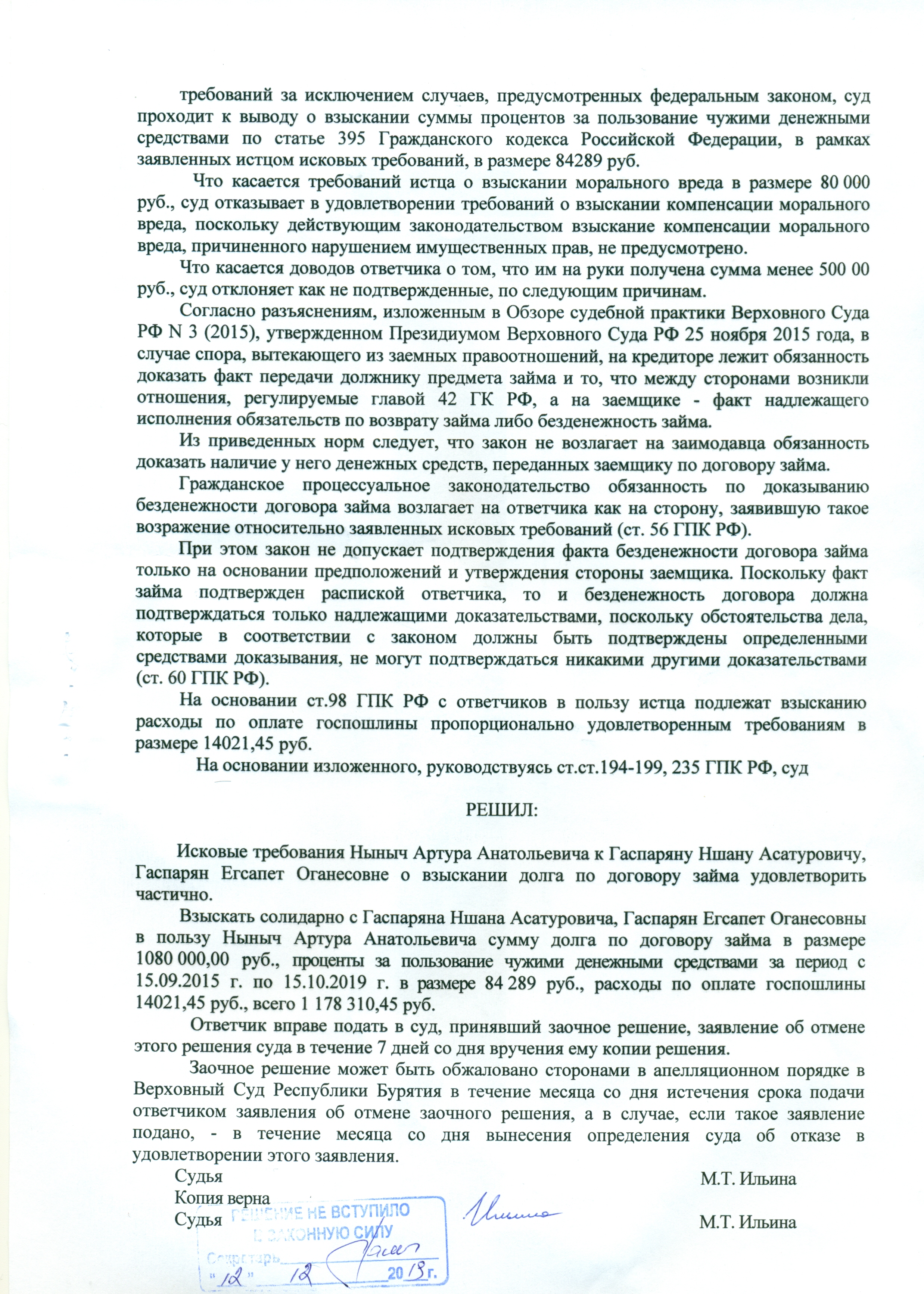 Сегодня прошло заочное судебное заседание без ответчиков но оно меня не устраивает и оно я считаю не правельным т.к сумма иска удовлетворена частично. Вот моё исковое заявление Цена иска составляют 1901604 руб. (один миллион девятьсот одна тысяча шестьсот четыре рубля) ИСКОВОЕ ЗАЯВЛЕНИЕ о взыскании долга по договору займа "15марта 2015 г. между мной и ответчиками Гаспарян Ншан Асатурович и Гаспарян Егсапет Оганесовна был заключен договор займа, по условиям которого ответчику передана в долг сумма 1000000 (один миллион рублей руб). на срок 6 месяцев по "15"09 2015 г., с выплатой процентов в размере 13333% ежемесячно. Условия договора закреплены письменно, подтверждаются распиской от 15марта 2015 г В соответствии со статьей 810 ГК РФ, заемщик обязан возвратить заимодавцу сумму займа в срок и в порядке, которые предусмотрены договором займа. 1. В установленный срок долг ответчиком мне не возвращен Размер долга на момент обращения в суд составляет составляют 1821604 руб. (один миллион восемьсот двадцать одна тысяча шестьсот четыре рубля) включая проценты. Расчет задолженности прилагается. В соответствии со статьей 395 Гражданского кодекса РФ, за пользование чужими денежными средствами вследствие их неправомерного удержания, уклонения от их возврата, иной просрочки в их уплате либо неосновательного получения или сбережения за счет другого лица подлежат уплате проценты на сумму этих средств. Период просрочки долга составляет 1 498 дней, размер банковской ставки на момент предъявления иска составляет 7 %, таким образом, сумма процентов на момент подачи иска в суд, за пользование чужими денежными средствами вследствие их неправомерного удержания составит 84289 (восемьдесят четыре тысячи, двести восемьдесят девять рублей) руб. Расчет прилагается. От долга не отказываются за часть долга предлагают 4-х комнатную квартиру, которая мне пока не нужна. А уважительная причина пропуска срока исковой давности — это моё заболевание, я инвалид с детства страдаю эпилепсией, всё это время нуждался в тяжёлой операции которую мне сделали в г. Новосибирске только 03.09.2019.т.к денежных средств на операцию всё это время у меня не было и ответчики мне не возвращали. А так же причина пропуска срока исковой давности, это обещания ответчиков вернуть всё это в полном объёме, последний тел. разговор от 21.10.2019 имеется, где в декабре Гаспарян Нишан Асатурович снова пообещал вернуть всю задолженность. . На основании изложенного, руководствуясь статьями 807, 810, 811 Гражданского кодекса РФ, статьями 131-132 Гражданского процессуального кодекса РФ, Прошу: Взыскать с Гаспарян Ншан Асатурович и Гаспарян Егсапет Оганесовна в мою пользу размер долга 1000000руб (один миллион рублей). по договору займа, проценты по договору 737315 (семьсот тридцать семь тысяч триста пятнадцать рублей), проценты за пользование чужими денежными средствами 84289 (восемьдесят четыре тысячи, двести восемьдесят девять рублей)., и моральный вред в размере 80000 (восемьдесят тысяч рублей) а всего 1901604 руб. (один миллион девятьсот одна тысяча шестьсот четыре рубля) Перечень прилагаемых к заявлению документов 1. Копия искового заявления 2. Документ, подтверждающий уплату государственной пошлины 3. Расчет задолженности (долга) 4. Расчет процентов 5. Копия денежной (долговой) расписки (договора займа) 6. мед. документы. Дата подачи заявления "22"октябр