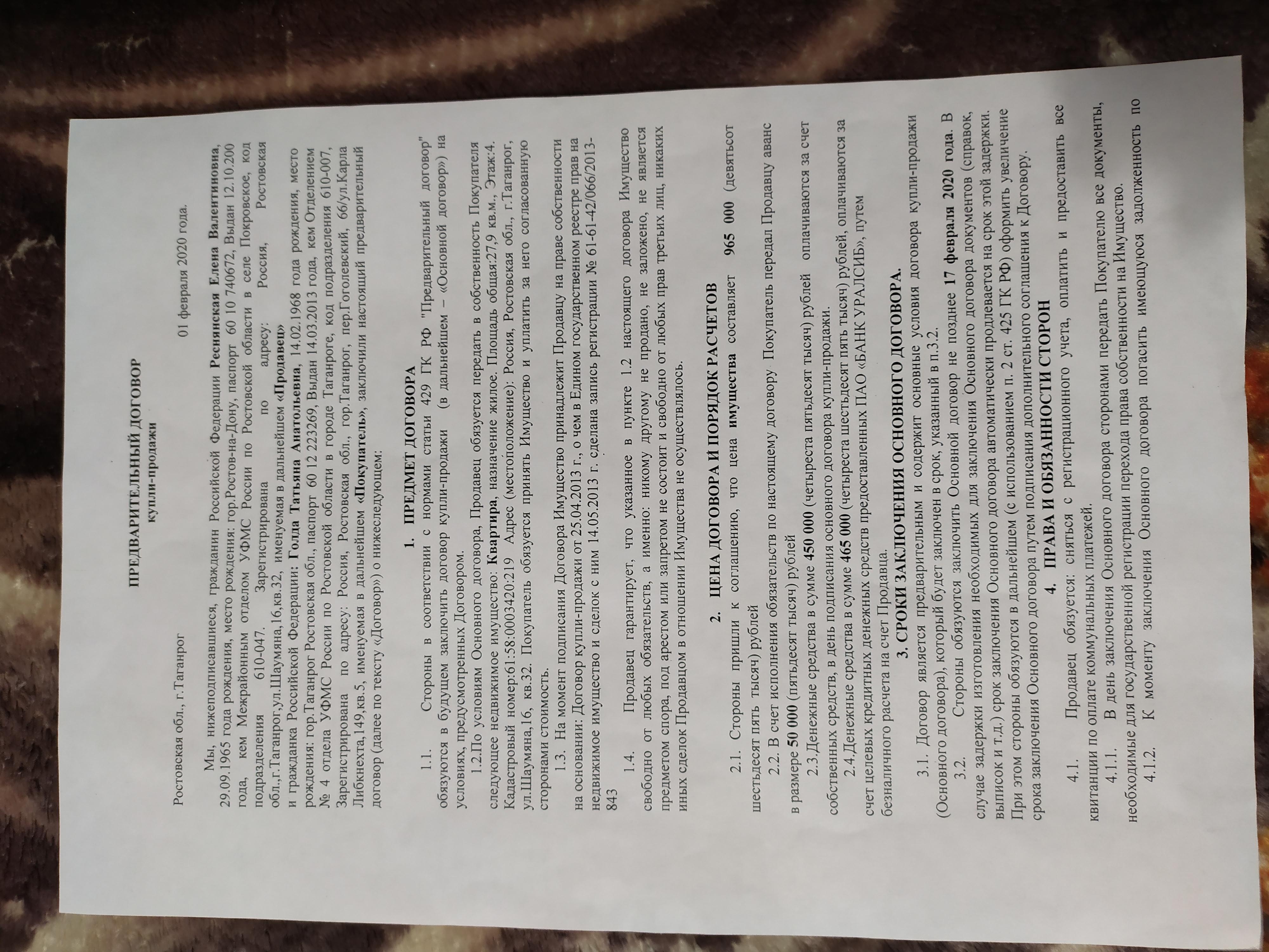 Добрый день! Подскажите пожалуйста! Мы продаем квартиру в Таганроге, чтобы купить в Ростове-на-Дону. Нашелся покупатель, был заключен предварительный договор, но часть денег на покупку покупателя нашей квартиры должен был одобрить банк. Покупатель внес 50 тыс предоплаты, а банк в результате не одобрил кредит. В итоге, мы потратились за регистрацию договора в Росреестре, чтобы вложиться в квартиру на Суворовском, сейчас необходимо еще коммунальные оплатить в продаваемой квартире, и вариант на Суворовском уже скорей всего потеряли. А в предварительном договоре обнаружили пункт, что если банк покупателю не одобряет кредит мы обязаны залог в 50 тыс вернуть! Законно ди это? И предварительный договор уже силу потерял, т. к. действовал до 17 февраля. Какие наши дальнейшие действия, подскажите? Должны ди мы в данном случае залог возвращать?Во вложении сам предварительный договор.