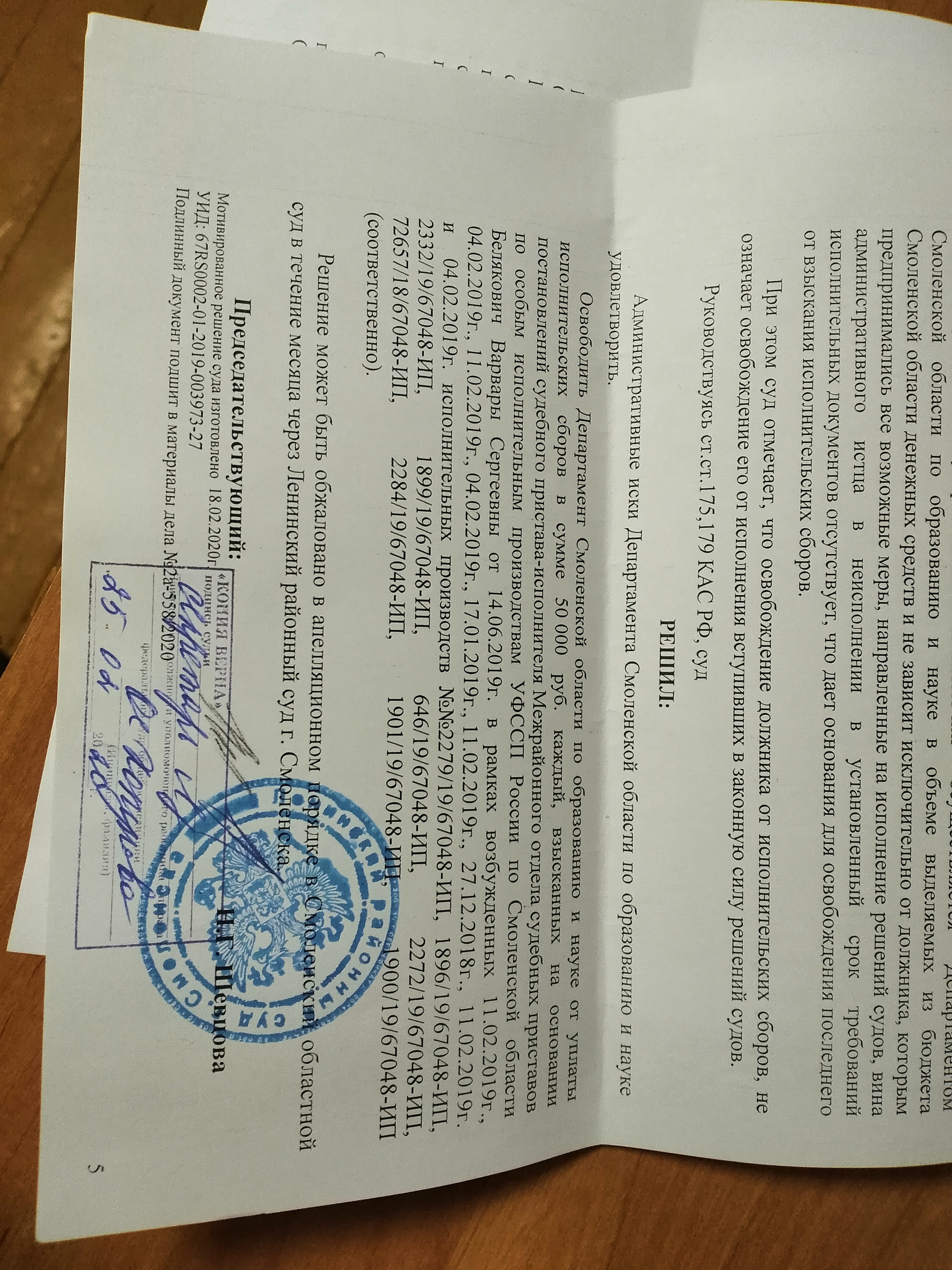Освободить департамент Смоленской области по образованию и науке от уплаты исполнительских сборов в сумме 50 000 руб. каждый, взысканных на основании постановлений судебного пристава-исполнителя Межрайонного отдела судебных приставов по особым исполнительным производствам УФССП России по Смоленской области Белякович Варвары Сергеевны . Что это значит?