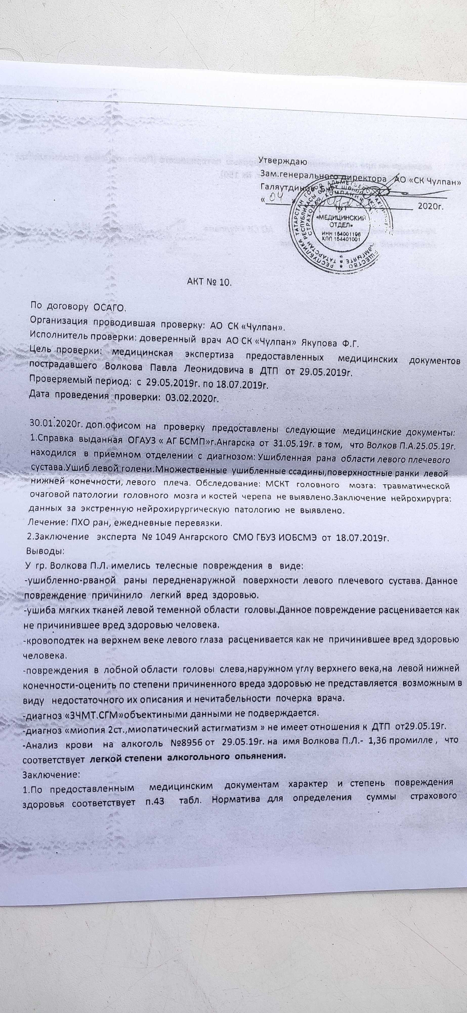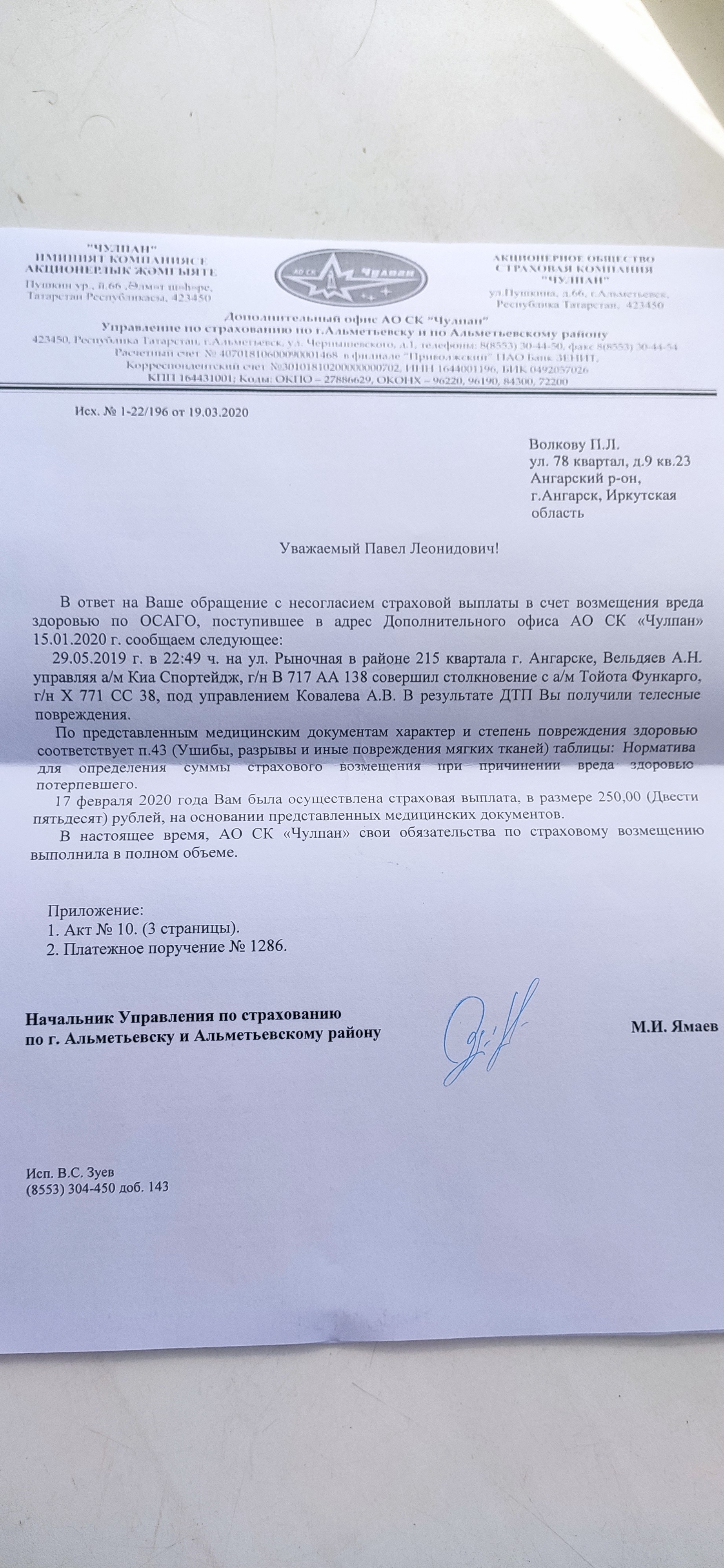 Здравствуйте . Было дтп , был причинён лёгкий ущерб здоровью, рваная рана плеча(шрам остался сантиметров 5 ) , ушибы , страховая заплатила 250 рублей , ссылаясь на пункт 43, законно ли это ? я больше ссылаюсь на пункт 40