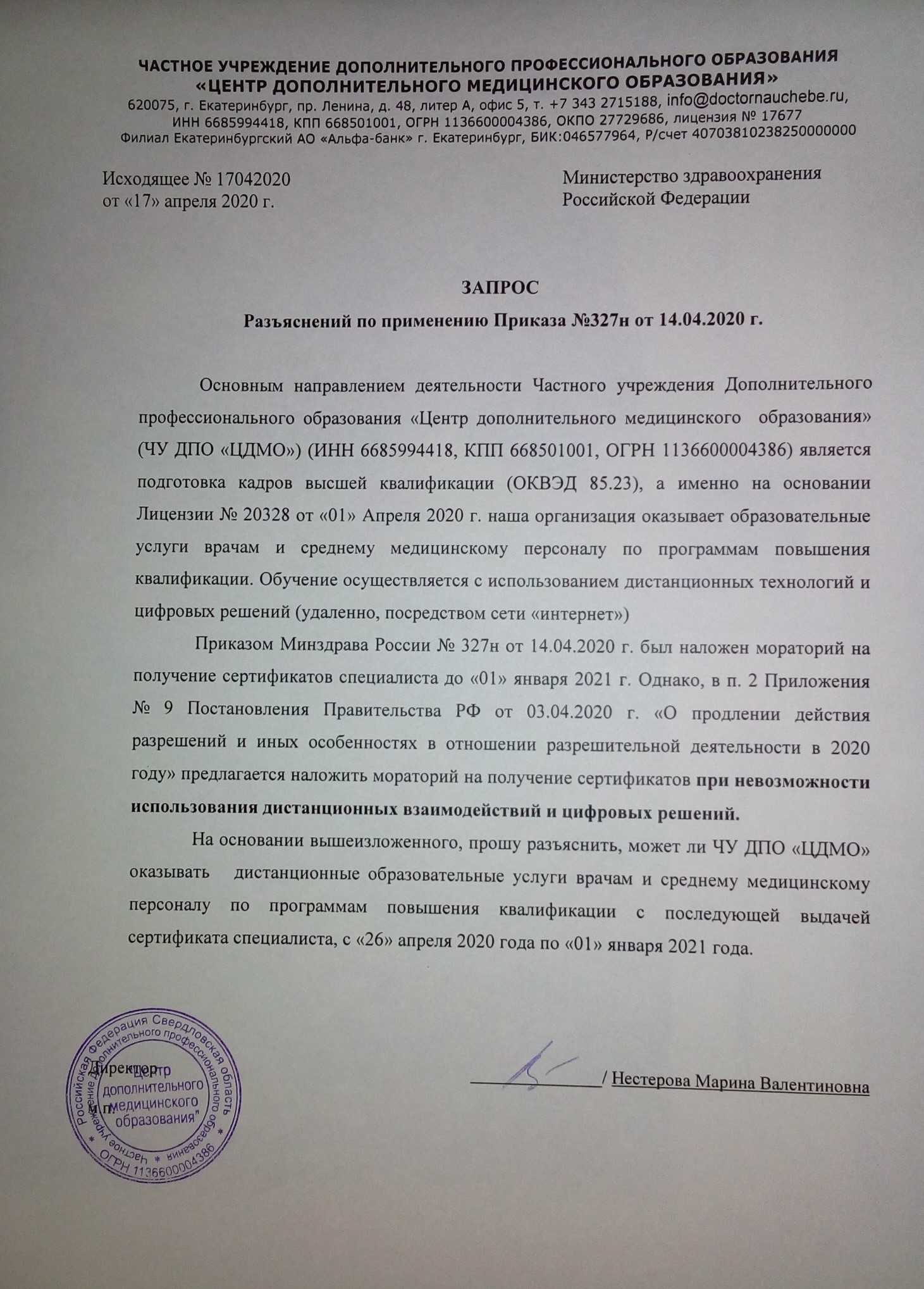 Основным направлением деятельности Частного учреждения Дополнительного профессионального образования «Центр дополнительного медицинского образования» (ЧУ ДПО «ЦДМО») (ИНН 6685994418, КПП 668501001, ОГРН 1136600004386) является подготовка кадров высшей квалификации (ОКВЭД 85.23), а именно на основании Лицензии № 20328 от «01» Апреля 2020 г. наша организация оказывает образовательные услуги врачам и среднему медицинскому персоналу по программам повышения квалификации. Обучение осуществляется с использованием дистанционных технологий и цифровых решений (удаленно, посредством сети «интернет») Приказом Минздрава России № 327н от 14.04.2020 г. был наложен мораторий на получение сертификатов специалиста до «01» января 2021 г. Однако, в п. 2 Приложения № 9 Постановления Правительства РФ от 03.04.2020 г. «О продлении действия разрешений и иных особенностях в отношении разрешительной деятельности в 2020 году» предлагается наложить мораторий на получение сертификатов при невозможности использования дистанционных взаимодействий и цифровых решений. На основании вышеизложенного, прошу разъяснить, может ли ЧУ ДПО «ЦДМО» оказывать дистанционные образовательные услуги врачам и среднему медицинскому персоналу по программам повышения квалификации с последующей выдачей сертификата специалиста, с «26» апреля 2020 года по «01» января 2021 года.