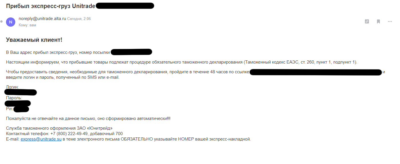 Здравствуйте, регулярно заказываю товар на Алиэкспрессе на небольшую сумму, посылки все приходили стабильно. Совершив очередной заказ, практически его получив, на электронную почту и в смс приходит письмо следующего характера: Уважаемый клиент! В Ваш адрес прибыл экспресс-груз, номер посылки ХХХ. Настоящим информируем, что прибывшие товары подлежат процедуре обязательного таможенного декларирования (Таможенный кодекс ЕАЭС, ст. 260, пункт 1, подпункт 1). Чтобы предоставить сведения, необходимые для таможенного декларирования, пройдите в течение 48 часов по ссылке ... На свой страх и риск перешел по ссылке и увидел следующее: Уважаемый клиент! Если Вы сделали заказ в одном из зарубежных интернет-магазинов и получили сообщение, отсылающее на эту страницу, ЭТО ОЗНАЧАЕТ, что UNITRADE в России (АО «Юнитрейд», свидетельство о включении в Реестр таможенных представителей № 0010/03 от 17.07.2018 г.) осуществит таможенное оформление товаров, следующих в Ваш адрес. В соответствии с Приказом ФТС от 05.07.2018 г. №1060 для таможенного декларирования товаров, следующих в Ваш адрес, Вам следует предоставить таможенным органам РФ дополнительные документы и сведения. Для ввода данных введите логин и пароль полученный по SMS или е-mail, и ПИН-код из sms для подтверждения сведений. Когда посылка была отправлена, я заметил, что продавец неверно указал адрес моего места жительства, я написал ему обращение с просьбой изменить его, он прочел, но не ответил ничего. Скажите пожалуйста, является ли данная организация мошенниками? Следует ли мне предоставлять им свои личные данные (паспорт, инн и т.д)? В интернете про эту компанию нашел множество негативных отзывов, прежде мне никогда не приходило похоже сообщение, под предлогом возврата посылки обратно.Связано ли это с ошибочными данными моего адреса? Заранее спасибо!