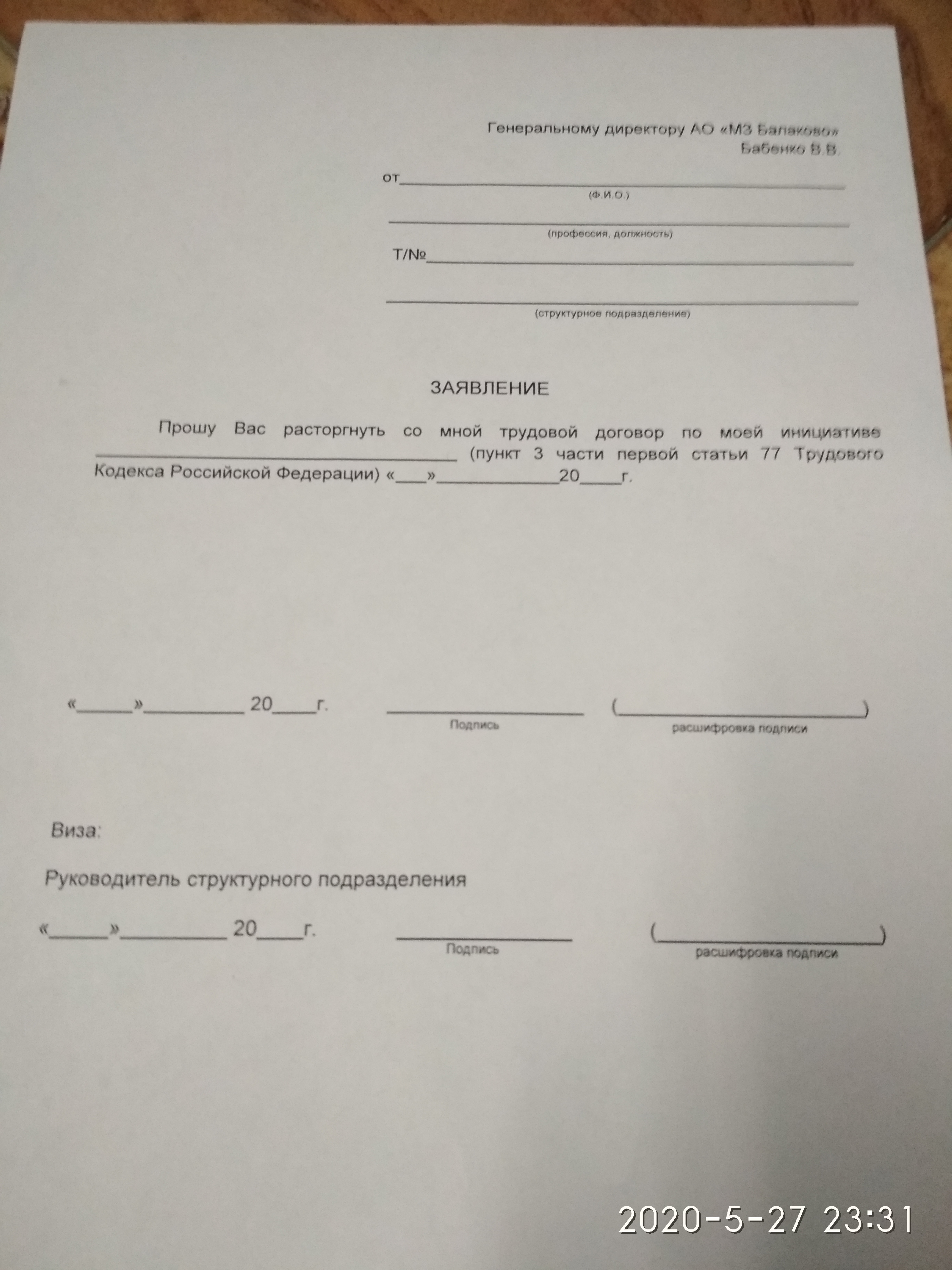 - Здравствуйте. Опишу ситуацию. Я работал на металлургическом заводе в подрядной организации 2 года 10 месяцев, завод на котором работал разрывает контракт с нашей организацией и компания на которую работали на сокращает, выплачивает выходное пособие. 30.04.2020 нас сократили. Завод нам предложил те же места рабочими только в их уже компании мы согласились прошли мед комиссию с 01.05.2020 работаем на эту организацию. Сегодня 27.05.2020 нам принесли бумажки (заявление на увольнение по собственному желанию) не чего не объяснили просто мастер сказал написать шапку и поставить подписи без даты. Уточнение. В договоре мы 3 месяца на испытатеоьном сроке. Вопрос. Законно ли это? И обязан ли я подписывать без даты? Могут ли мне просто сказать так как вы на испытательном сроке то мы расторгаем договор?