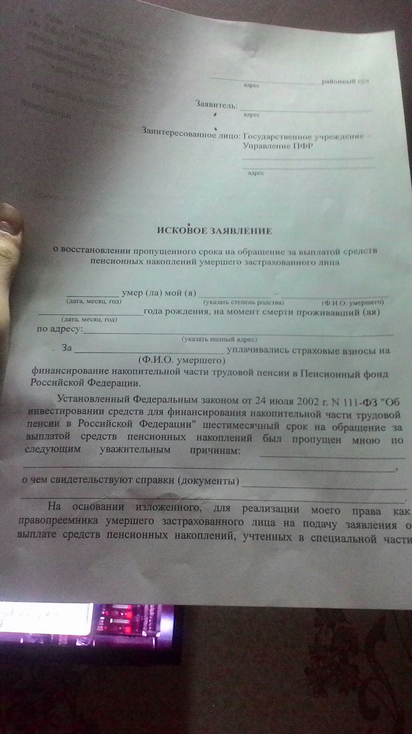Пенсионные накопления исковое заявление