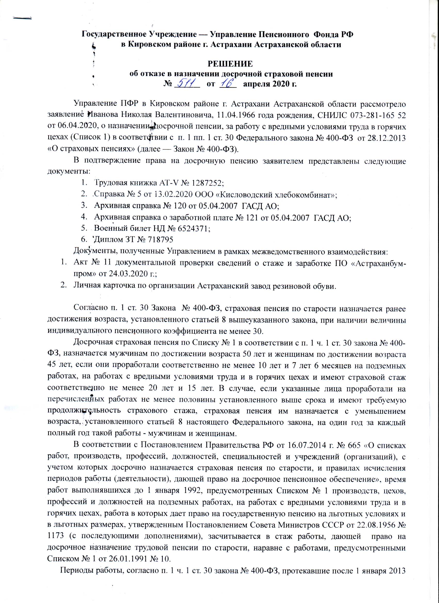 ОТКАЗ В ДОСРОЧНОЙ ЛЬГОТНОЙ СТРАХОВОЙ ПЕНСИИ