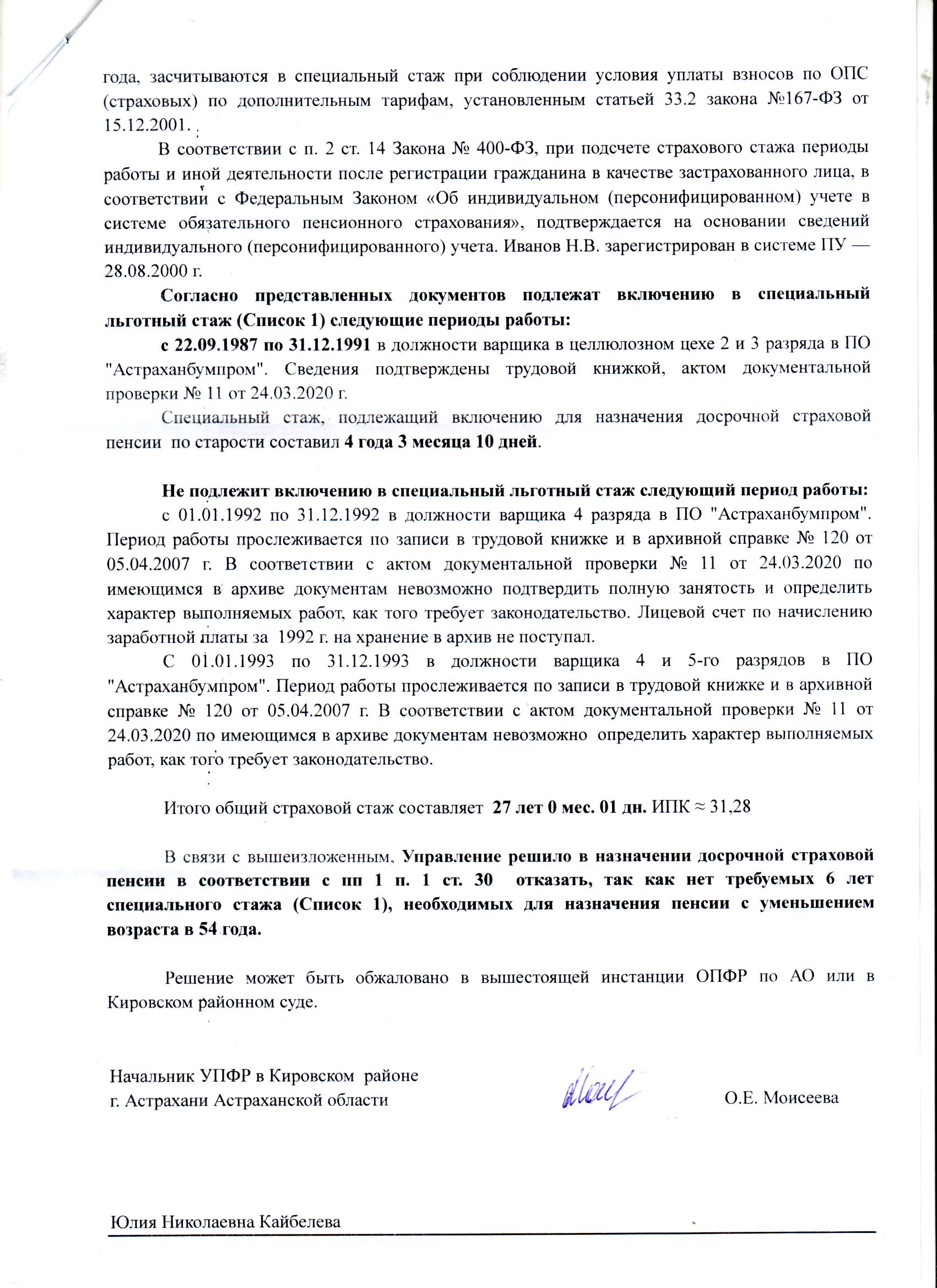 Добрый день!Мне отказали в ПФР досрочной льготной пенсии .род. 11.04.1966г . Я проработал на вредном предприятие 6 лет 3 мес период 22.09.1987 - 31.12.1993 список 1, XVII. Целлюлозно-бумажное производство 1170100а-11404 Варщики целлюлозы ,в трудовой книжке все зафиксировано.В пфр мне засчитали 4 г. 3 мес. 10 дн. ,получается 1992 , 1993гг мне не зачислили ,пишут невозможно подтвердить полную занятость и характер выполняемых работ по архивным данным. За 1992г в архиве не сохранился лицевой счет по начислению заработанной платы , 1993г сведения о зарплате есть. Есть документ из архива ,подтверждающий перечень профессий на Астраханском Целлюлозном Картонном Комбинате ,работа которых дает право на получение льготной пенсии по списку № 1. Профессию варщика целлюлозы на АЦКК Астраханбумпром исключили 01.02.1994г.Что теперь предпринять?