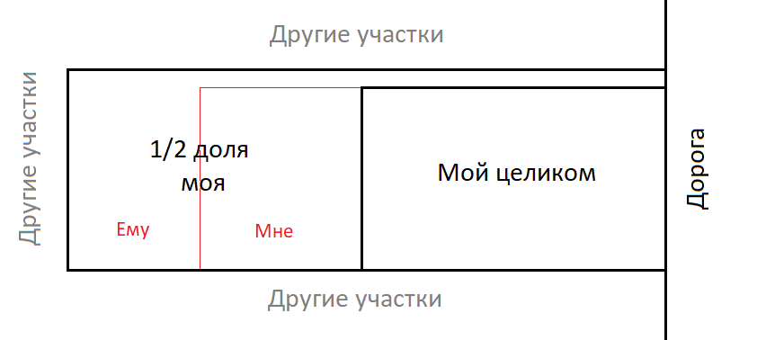 Мой участок идет вдоль дороги. А участок где у меня доля находится сразу за моим участком, на второй линии, и не имеет подъезда; к нему вдоль моего участка идет дорожка для прохода шириной около 1.5 м (является частью этого же участка).