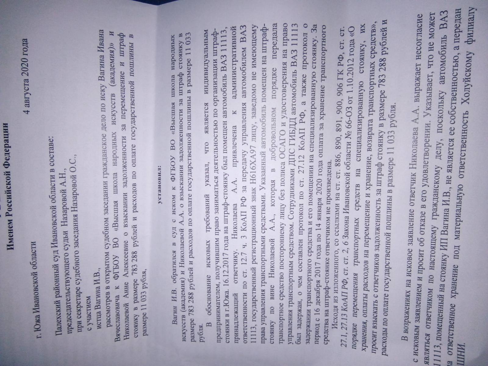«07» августа 2020 года, Палехским районным судом было вынесено решение по гражданскому делу по иску Вагина Ивана Вячеславовича к директору ФГБОУ Николаевой Анне Алексеевне о взыскании за услуги штрафной стоянки.