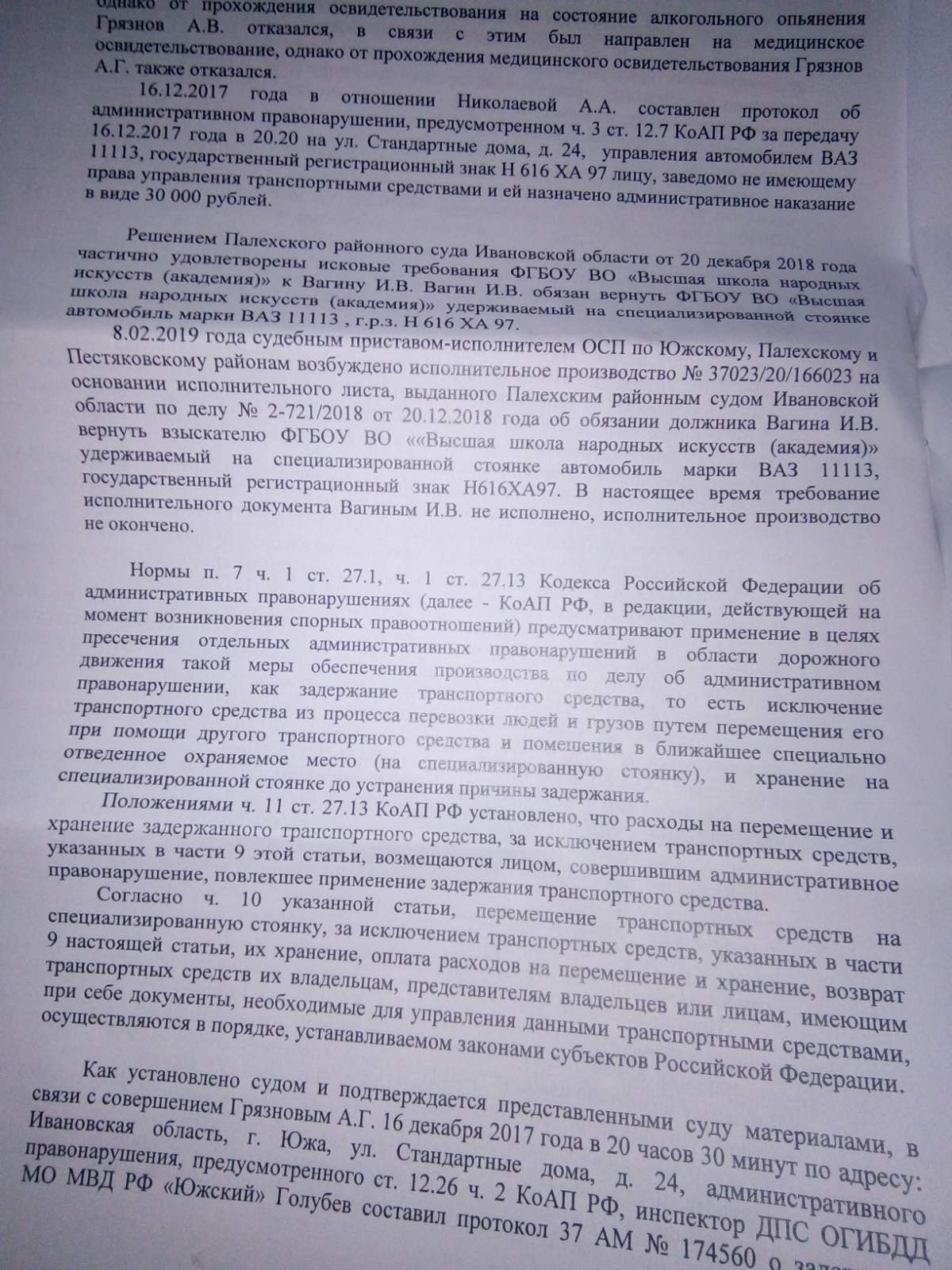 В решении Палехского районного суда Ивановской области от 7августа 2020 года указано, что Решением Палехского районного суда Ивановской области от 20.12.2018 года, которым я обязан вернуть ФГБОУ ВО «Высшая школа народных искусств (академия)» удерживаемый на специализированной стоянке автомобиль , до настоящего времени мной не исполнено, данное транспортное средство незаконно удерживается мной.
