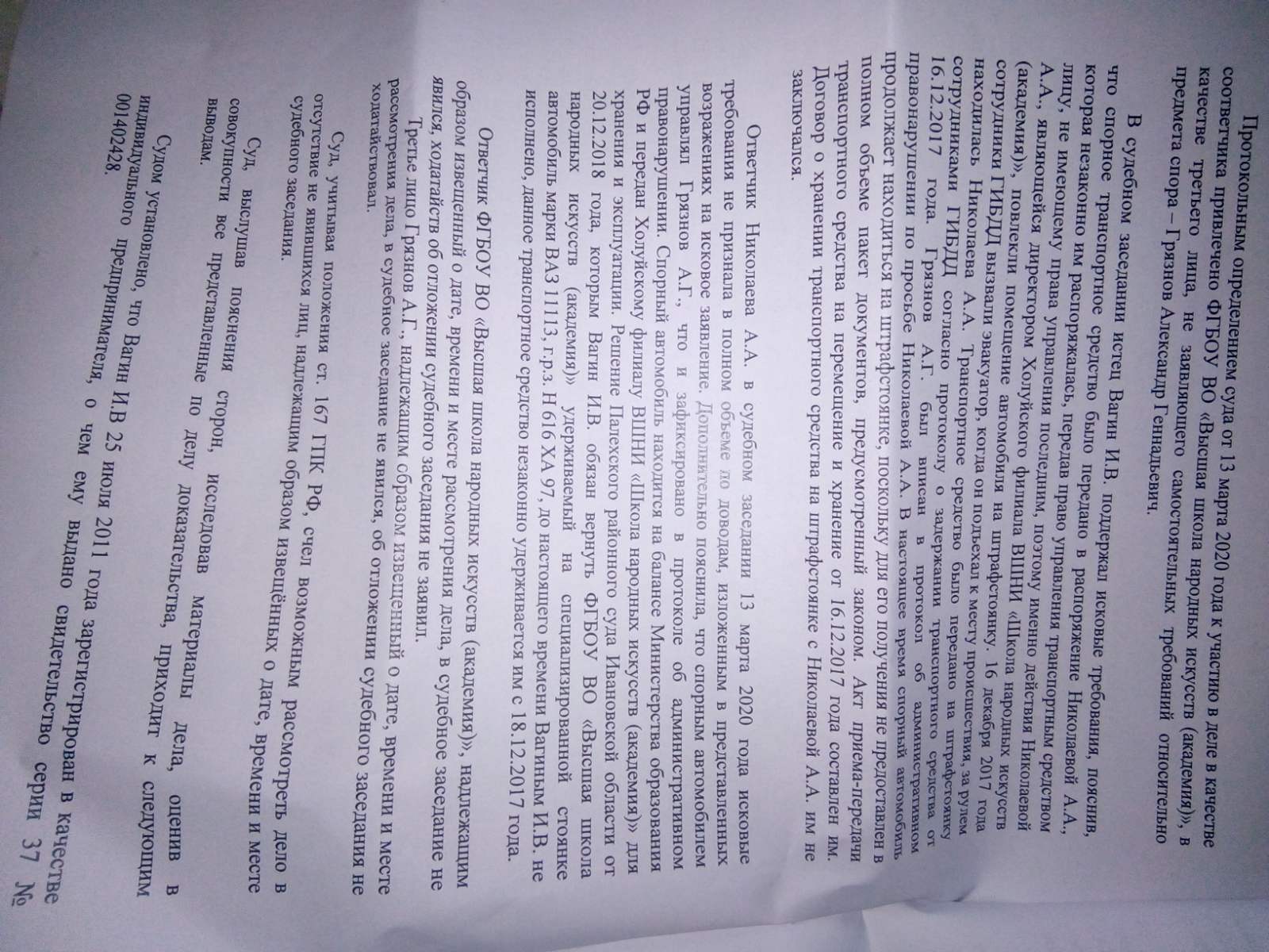 В судебном заседании я поддержал исковые требования, пояснив, что спорное транспортное средство было передано в распоряжение Николаевой А.А под материальную ответственность, которая незаконно им распоряжалась, передав право управления транспортным средством лицу, не имеющему права управления последним, поэтому именно действия Николаевой А.А, являющейся директором Холуйского филиала ВШНИ «Школа народных искусств (академия)», повлекли помещение автомобиля на штрафстоянку. 16.12.2017г.когда сотрудники ГИБДД вызвали эвакуатор, когда он подъехал к месту происшествия с водителем Нестеровым Н.А который так же видел что за рулём находилась именно Николаева А.А в состоянии опьянения.Транспортное средство было передано на штрафстоянку сотрудниками ГИБДД согласно протоколу о задержании транспортного средства от 16.12.2017. Грязнов А.А был вписан в протокол об административном правонарушении по просьбе Николаевой А.А чтобы спасти водительское удостоверение Николаевой. В настоящее время спорный автомобиль продолжает находиться на штрафстоянке, поскольку для его получения не предоставлен в полном объеме пакет документов, предусмотренный законом и Николаева А.А отказывается что бы выдача происходила путём эвакуации как это указано в протоколе на выдачу автомобиля сотрудниками ГИБДД. При составлении мною акта приёма передачи автомобиля присутствовала только Николаева А.А.