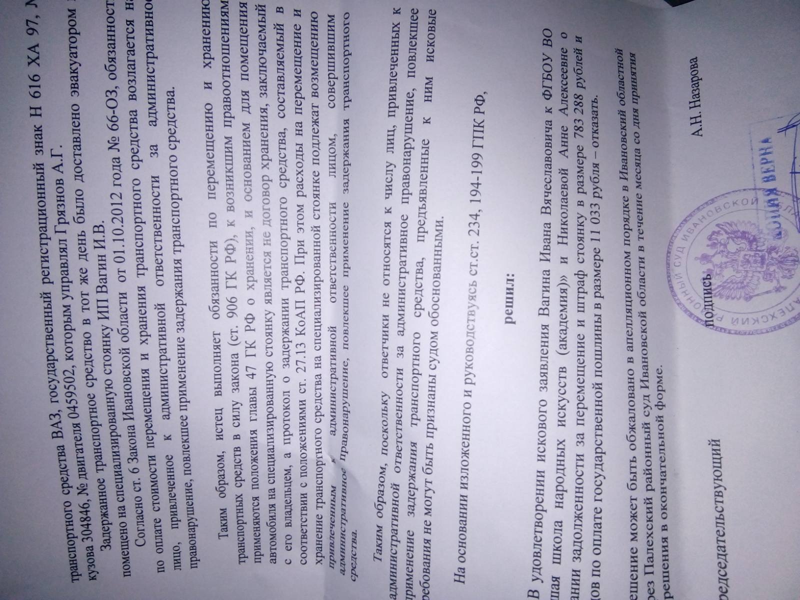 1.Изменить решение_ Палехского районного суда от «7»августа 2020г. по иску _ Вагина Ивана Вячеславовича к _ к директору ФГБОУ Николаевой Анне Алексеевне о взыскании за услуги штрафной стоянки.