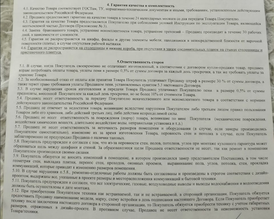 ДОбрый день! 20.09.2020 был заключен договор на изготовление кухонного гарнитура, согласно договора изготовление и передача товара в течении 45 календарных дней. Выходил замерщик от фабрики, замеры провел , дизайн согласован. на 45-й день назначена сборка гарнитура, до этого был оплачен гарнитур в 100% размере+замер. Оплата за монтаж и подключение электрики и к водоснабжению техники оплачивается по факту. также сборщиком нам была оказана услуга демонтажа старой раковины из кухни. в процессе монтажа, монтажником был выявлен ряд недочетов в деталях гарнитура, о чем он сообщил нам и менеджеру-дизайнеру: несоответствие размеров столешницы, барной стойки, двух фасадных панелей. менеджер-дизайнер устно признала ошибку замерщика и ссылаясь на пандемию объяснила нам, что порядка двух недель ожидания. по факту что имеем: кухня полностью заставлена деталями кухонного гарнитура и фурнитуры, демонтирована раковина, плиту поставить некуда. пришлось приобрести мультиварку, посуду мыть в ванной комнате, в ней сделать ремонт и она не приспособлена для мытья посуды. Раковина плоская, в нее ничего не входит. Пищу готовить в одной мультиварке довольно проблематично. У нас семья из трех человек, в т.ч. ребенок, питание скудное. Мой хронический гастрит дал о себе знать. ванна в ужасном состоянии из за постоянной мойки грязной посуды. в договоре есть следующие пункты об ответственности сторон и сроках: глава 4 Гарания качества и комплектность 4.4. Замена бракованного товара, устранение некомплектности товара, утранение претензий - Продавец производит в течении 30 рабочих дней, в зависимости от сложности. глава 5 Ответственность сторон 5.7. Продавец не несет ответственность за неточность размеров помещения и оборудования (в случае, если замеры производились Покупателем самостоятельно), изменение их за время изготовления Товара, неровность стен и потолка в случае, если Покупатель заблаговременно не предупредил Продавца о наличии таковых. Замеры, повторюсь, делал специалист фирмы, ремонт не производился нами после них. на сегодня так и нет четкой информации о домонтаже гарнитура. у меня вопрос: я могу упирать на какую статью закона о компенсации или иного? цели судится нет, есть цель ускорить работу специалистов данной фирмы. заранее спасибо за ответ!