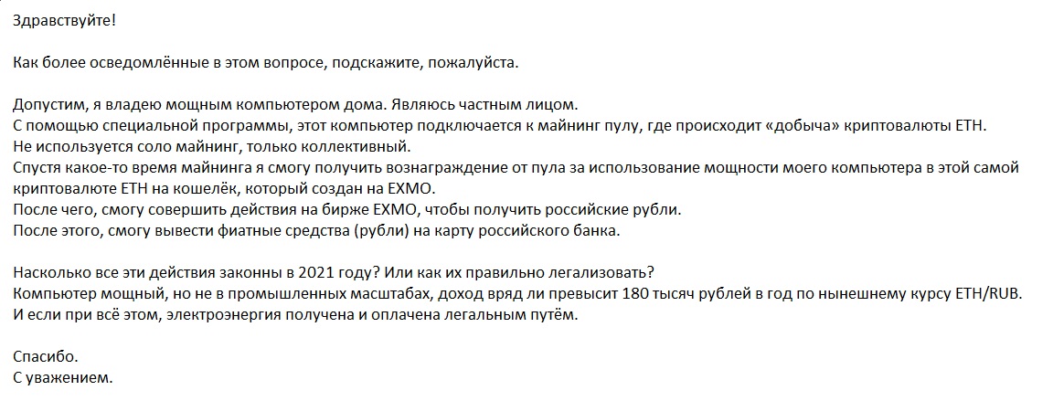 Здравствуйте! Как более осведомлённые в этом вопросе, подскажите, пожалуйста. Допустим, я владею мощным компьютером дома. Являюсь частным лицом. С помощью специальной программы, этот компьютер подключается к майнинг пулу, где происходит «добыча» криптовалюты ETH. Не используется соло майнинг, только коллективный. Спустя какое-то время майнинга я смогу получить вознаграждение от пула за использование мощности моего компьютера в этой самой криптовалюте ETH на кошелёк, который создан на EXMO. После чего, смогу совершить действия на бирже EXMO, чтобы получить российские рубли. После этого, смогу вывести фиатные средства (рубли) на карту российского банка. Насколько все эти действия законны в 2021 году? Или как их правильно легализовать? Компьютер мощный, но не в промышленных масштабах, доход вряд ли превысит 180 тысяч рублей в год по нынешнему курсу ETH/RUB. И если при всё этом, электроэнергия получена и оплачена легальным путём. Спасибо. С уважением.