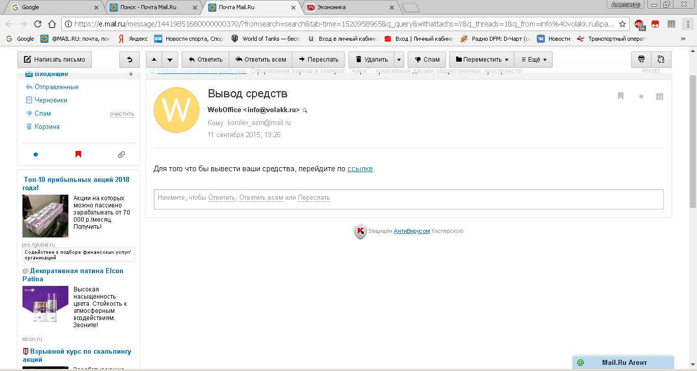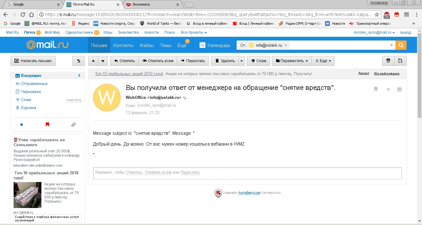 Добрый день, не знаю можете ли вы чем то помочь.... У меня произошло следующее когда то давно энные люди соблазнили меня вложиться в брокерскую компанию (торговля на форексе). Сам дурак, почти все слил но осталась 1000 баксов. Компания из моего города как оказалось уже давно съехала и офиса в моем городе уже нет (в Самаре). Общаются со мной только через личный кабинет почтой. Создай заявку на вывод средств сначала они сказали что их кинули "деньги онлайн" и не могут средства вывести, теперь они заключили договор с Orange Pay но опять проблемы!!! Вот что отвечаот: Так же агент выпускающей карты для Вашего банка находится в USA. Из опрошены клиентов в РФ, сообщили нам, что выводили средства на карты банков Сбербанк, Банк Русский стандарт, ВТБ. Если у Вас нет своей карты, платежная система позволяет воспользоваться картами друзей и близких. Далее я воспользовался картой Сбера но как оказалось она тоже из США.... (до нее пробовал Альфа-Банк и промсвязь банк и даже яндекс деньги). Да и брокер это "Волак"http://volakk.ru/ (сайт отображается, но теперь не могу зайти в личный кабинет ). Есть ли смысл что то предпринимать? Или уже лучше смотрится с потерей.