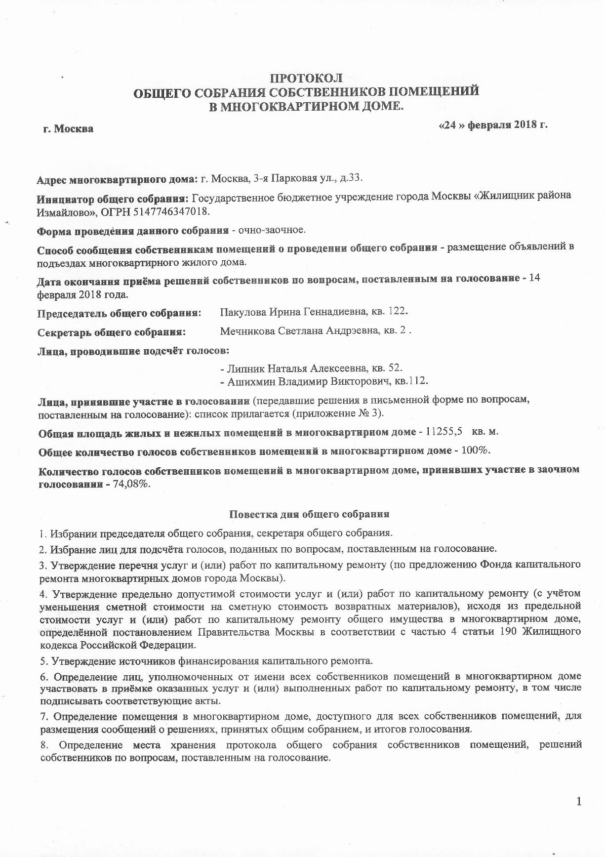 Исходя и Протокола от 24.02.2018г. следует, что форма проведения данного собрания - ОЧНО-ЗАОЧНОЕ, однако из объявления, а также бланка "Рассмотрение вопросов повестки дня общего собрания" следует, что голосвание проводилось ЗАОЧНО.