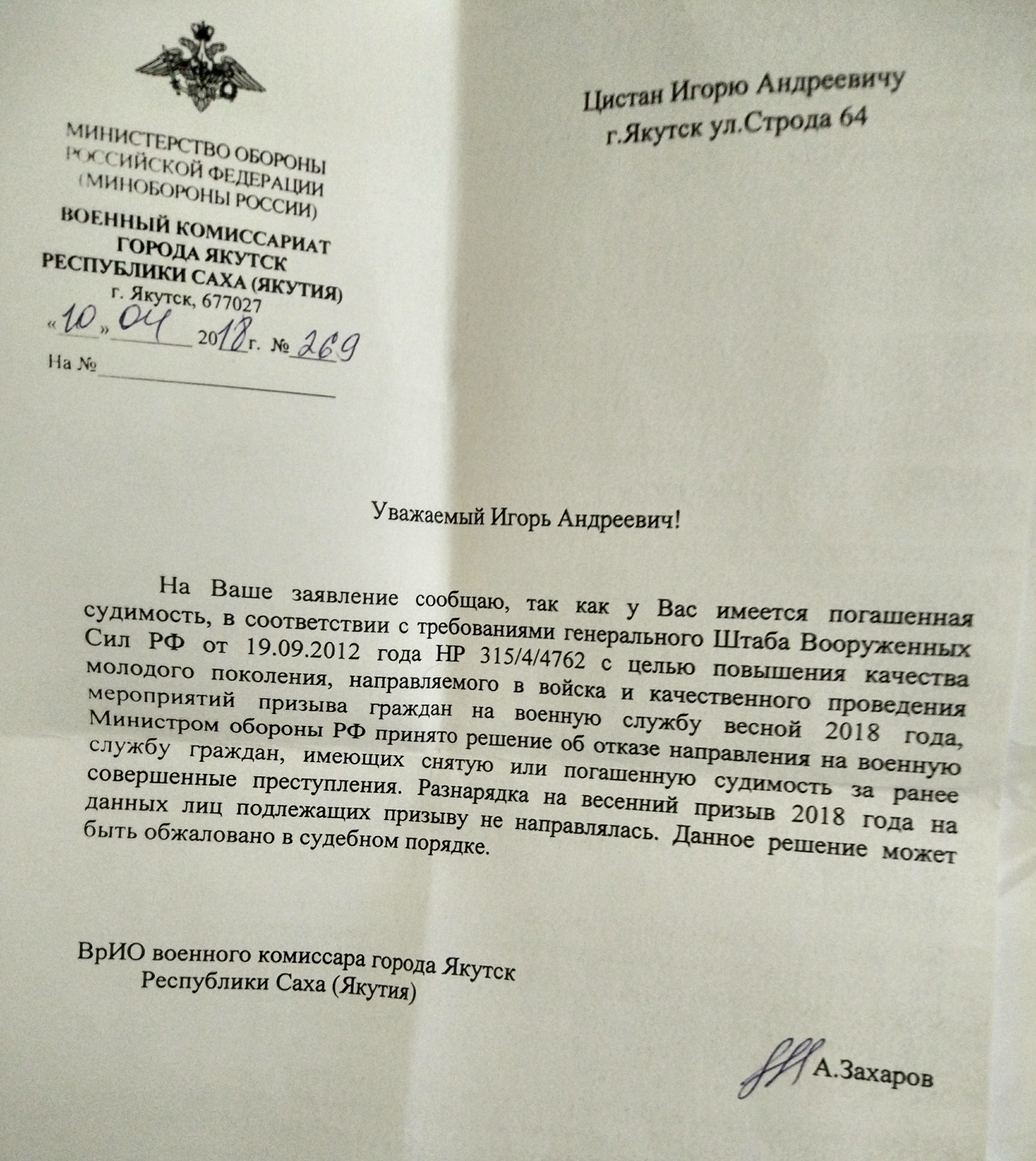 Здравствуйте, отказали от службы в армии, по здоровью годен, А1. Лет 8-9 назад был условный срок по 158, и исходя из этого личное дело в военкомате перечеркнули и сказали явиться в 27 лет. Хочу судиться, но не знаю какие документы нужны и куда направлять