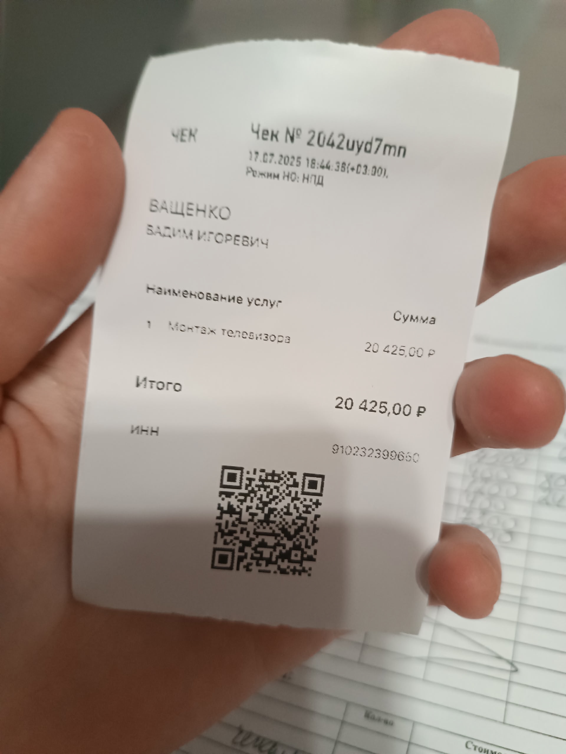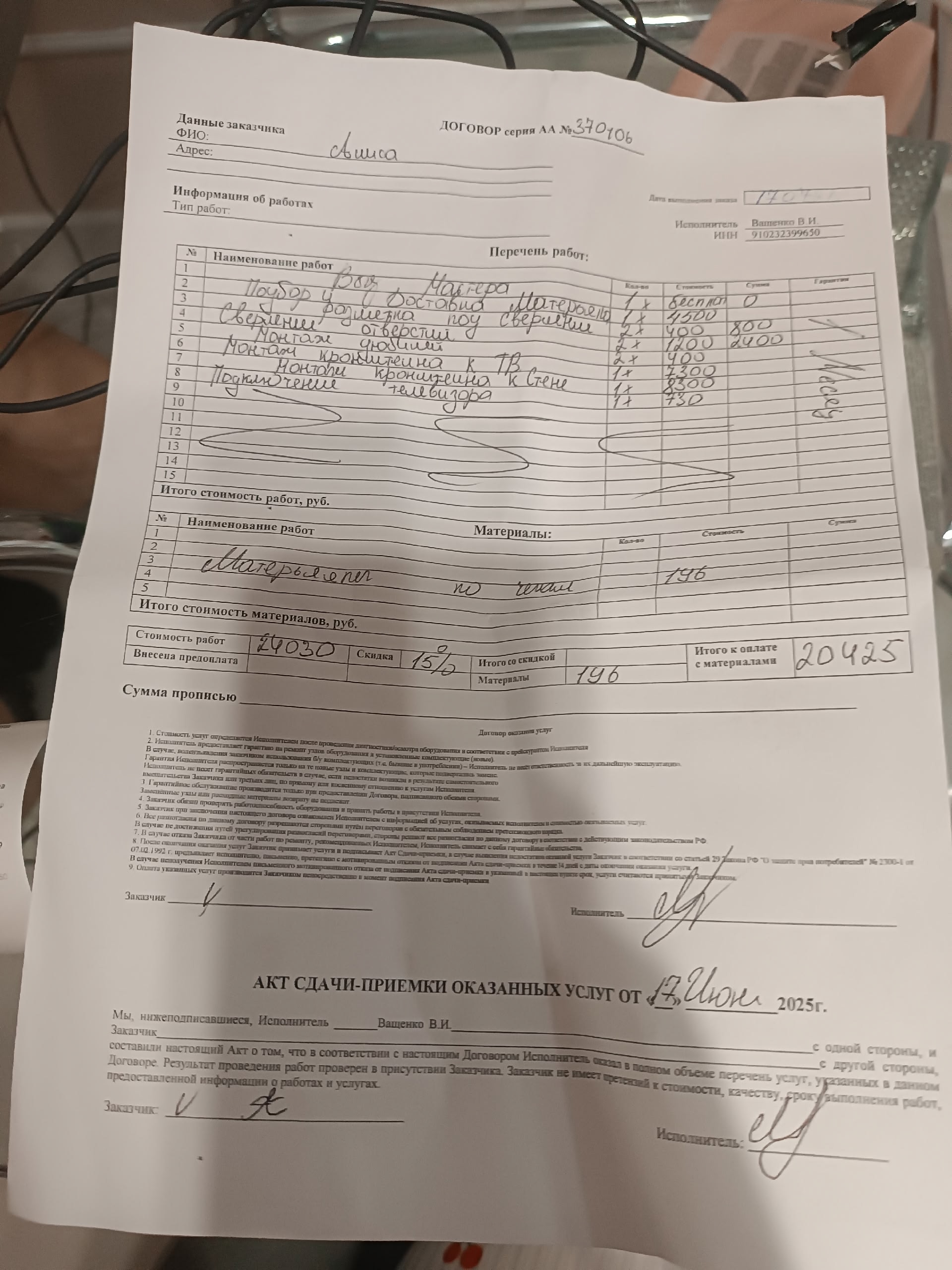 17.07.2025 через сайт profivdom.ru мы вызвали мастера, чтобы он повесил телевизор на стену. Мастера приехали на квартиру поздно, и когда их спросили, сколько будет стоить работа, они ответили: "Мы посчитаем это после того, как сделаем", а после того, как работа была выполнена, нам выдали чек на 20 000 рублей, что разительно отличается от цен, указанных на сайте, где мы заказали эту услугу. В квитанции на оплату были указаны следующие полное имя и ИНН, Вадим Иванович Ващенко, ИНН 910232399650, средства были переведены на имя Ващенко Вадима Игоревича, хотя ИНН на чеке был тот же. Что нам делать и как вернуть средства