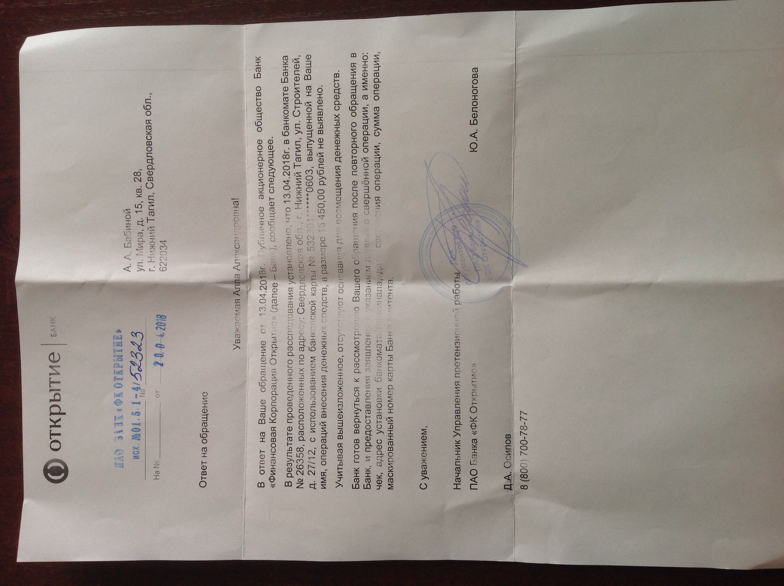 В банке "Открытие" брала кредит на 5 лет. Выплатила уже 4,4 года. 13.04.2018 пошла вносить платёж в филиале банка "Открытие", у меня зажевало денежные средства в размере 15450₽ а также банковскую карту, операцию терминал не завершил и открыл главную страницу. Таким образом ни чек ни деньги терминал не выдал. Тут же, в этом же фелиале написала заявление-притензию. Сегодня 04.05 получила письмо от банка, в котором написано что в результате проведения расследования установлено , что 13.04 в банкомате внесение денежных средств не выявлено, просят предоставить чек. О каком чеке может быть речь , если зажевало деньги,карту и операция не закончена была. Написала повторную притензию. Что делать в таком случае?