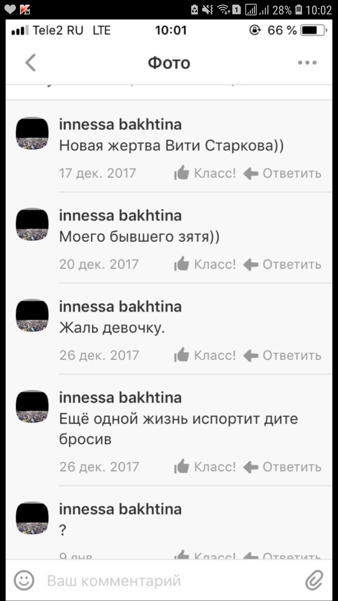 В представленных скринах комментариев ничего оскорбительного не содержится, единственное, если эти сведения не соответствуют действительности, то можно инициировать гражданский иск о защите чести и достоинства (ст.152 ГК РФ), аналогичным образом в рамках гражданского судопроизводства можно принять меры к защите изображения (ст.152.1 ГК РФ).